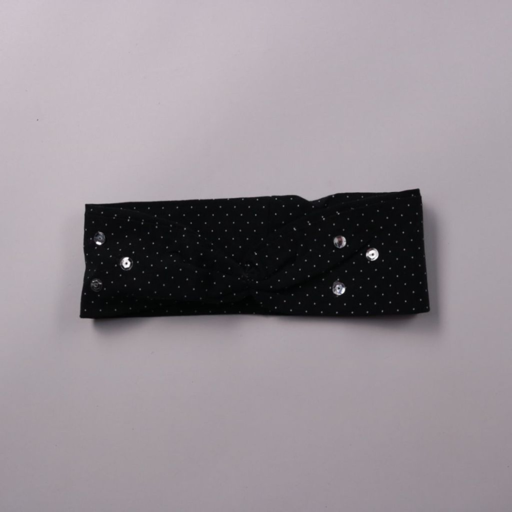 Текстильная повязка для волос чёрного цвета в мелкий горошек, с декоративными пайетками. Подойдёт для повседневных образов и чтобы аккуратно убрать волосы во время макияжа или занятий. Лёгкая и компактная, удобно брать с собой.