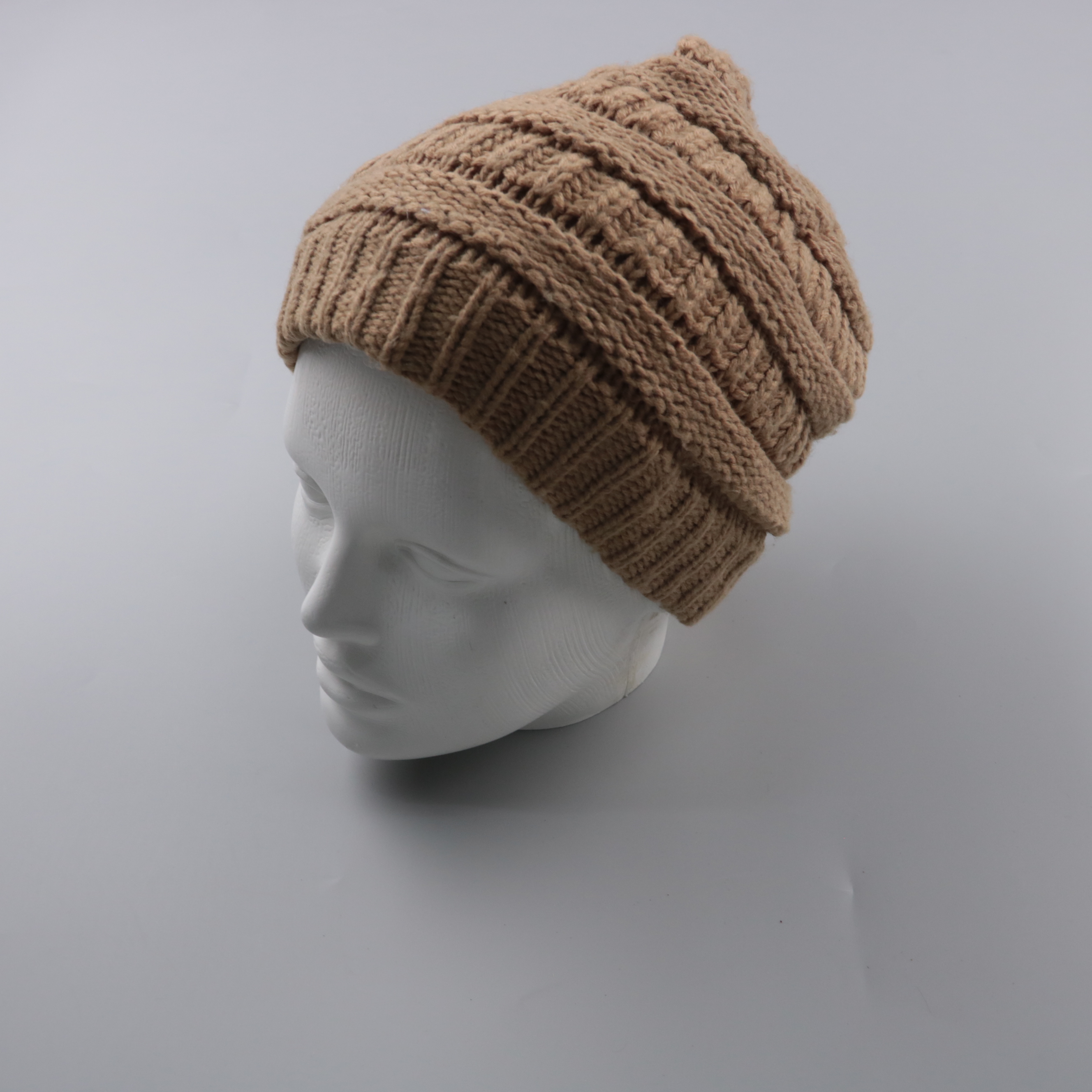 Вязаная шапка-бини крупной вязки в бежевом цвете. Подойдёт для повседневных образов в холодную погоду, хорошо закрывает уши за счёт широкого отворота. Плотная пряжа даёт больше тепла и держит форму.