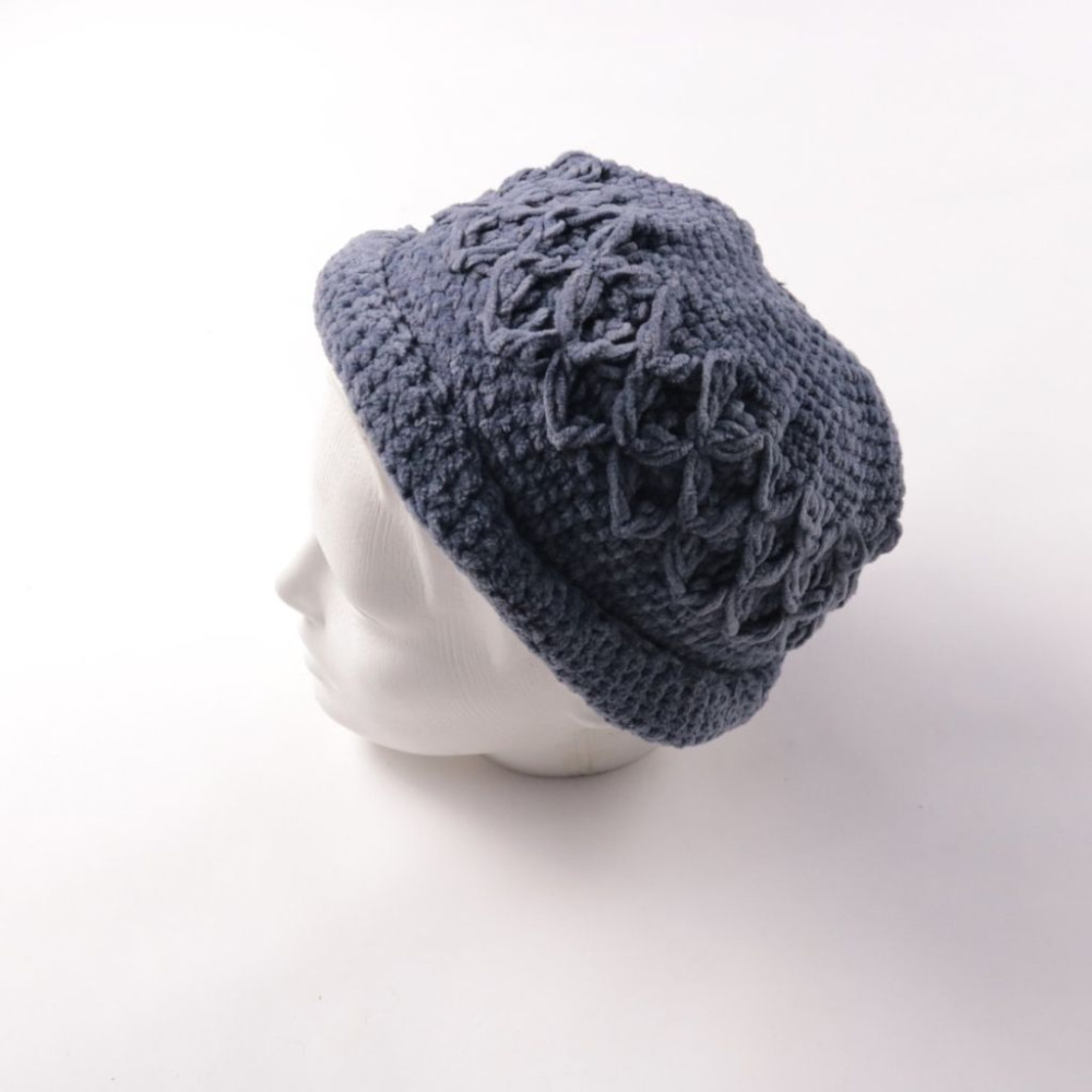 Вязаная шапка-бини без бренда в серо-синем цвете, с фактурным узором и небольшим отворотом. Подойдёт для прохладной погоды осенью и весной, хорошо сочетается с повседневной верхней одеждой. Мягкая вязка комфортно садится по голове и удобно носится кажд...