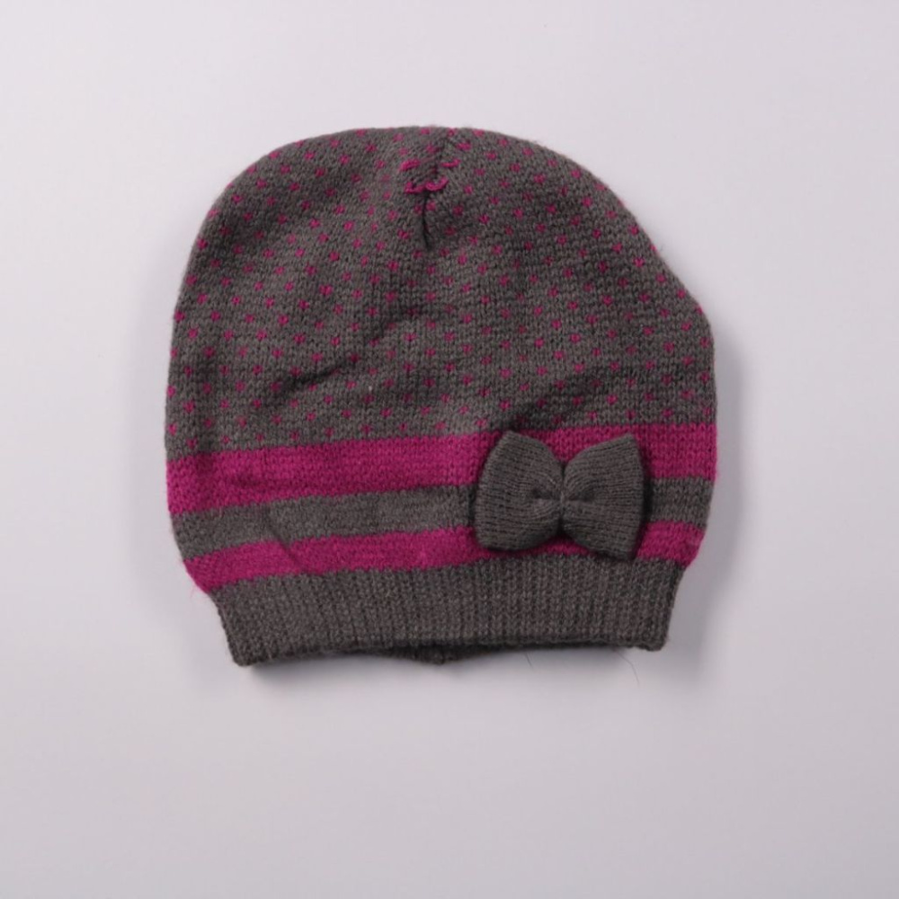 Вязаная шапка с бантиком, серого цвета с розовыми полосками. Подойдёт для холодной погоды и повседневных прогулок. Мягкая и лёгкая, не требует сложного ухода.
