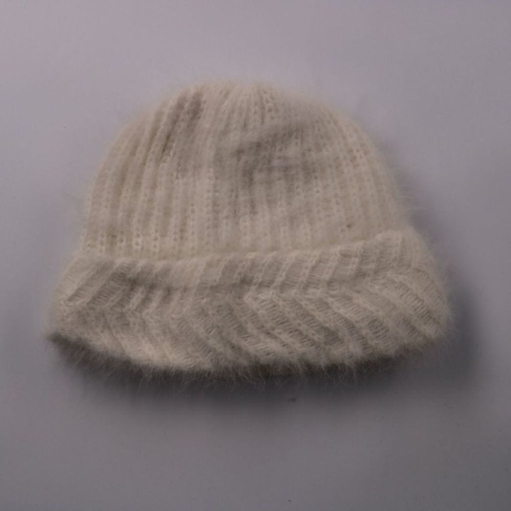 Вязаная шапка без бренда в молочном цвете, мягкая и пушистая (ангора в составе). Подойдёт для холодной погоды и повседневных зимних образов. Лёгкая и тёплая, хорошо закрывает уши за счёт широкого отворота.