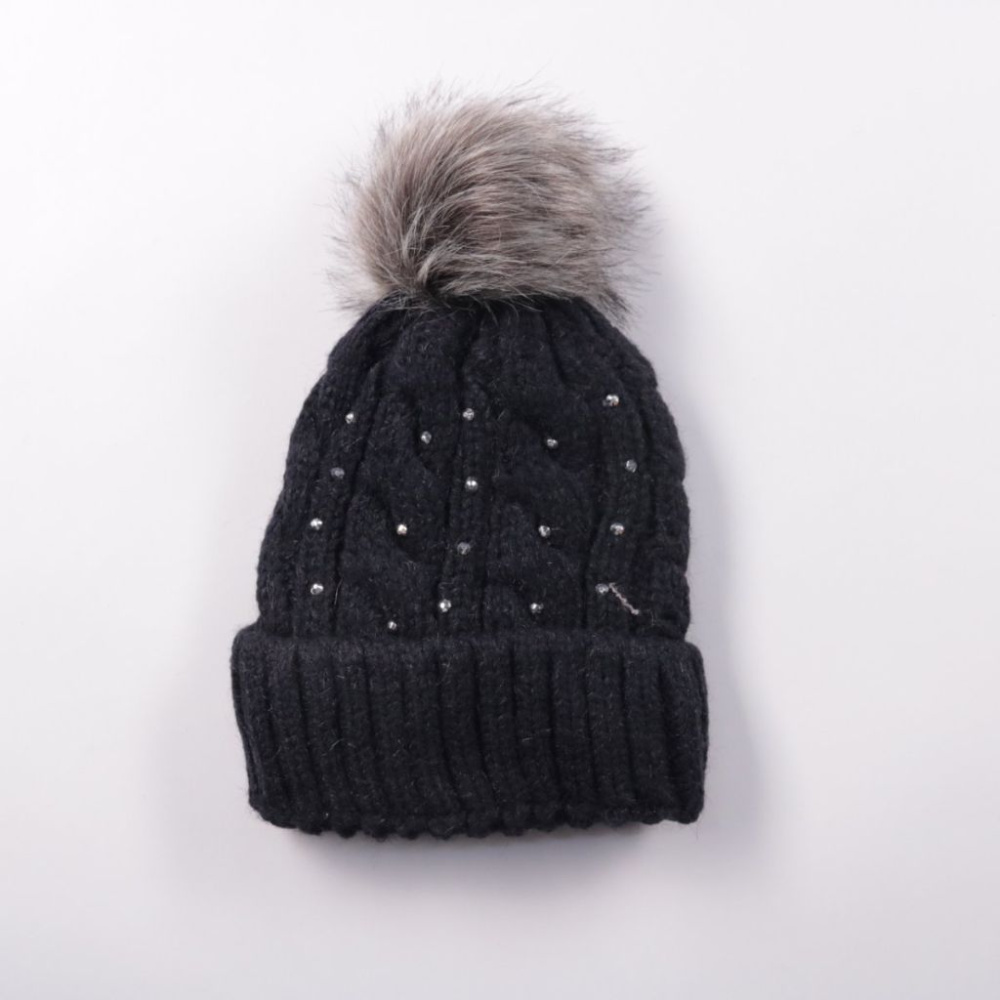 Вязаная шапка с помпоном и мелкими декоративными стразами. Подойдёт для зимних прогулок и повседневной носки, мягкая внутренняя подкладка приятна к коже. Хорошо закрывает уши и удерживает тепло.