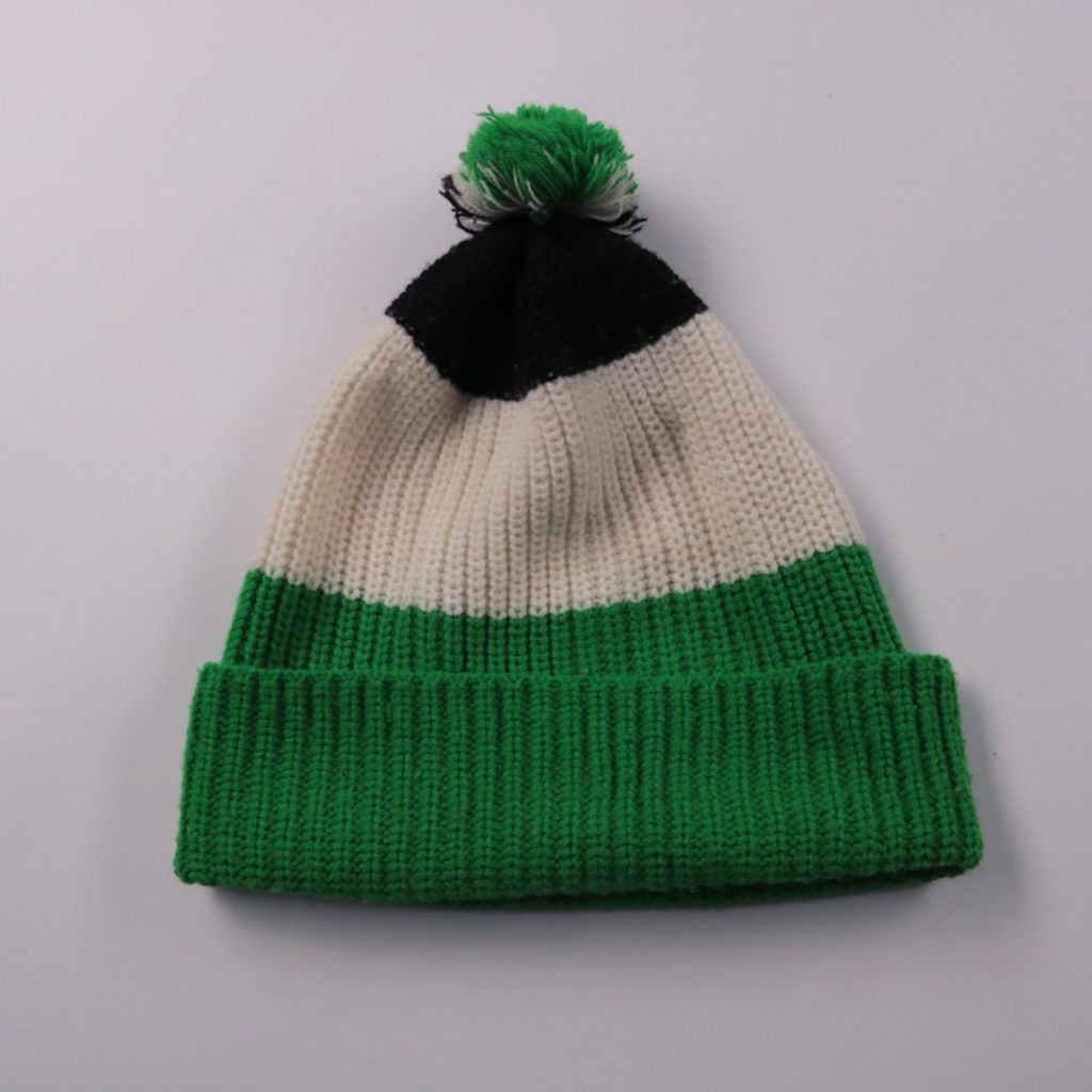 Вязаная шапка-бини с помпоном, без указания бренда, в полоску зелёного, белого и чёрного цветов. Подойдёт для повседневной носки в холодную погоду и прогулок. Мягкий трикотаж хорошо тянется и удобно садится по голове.