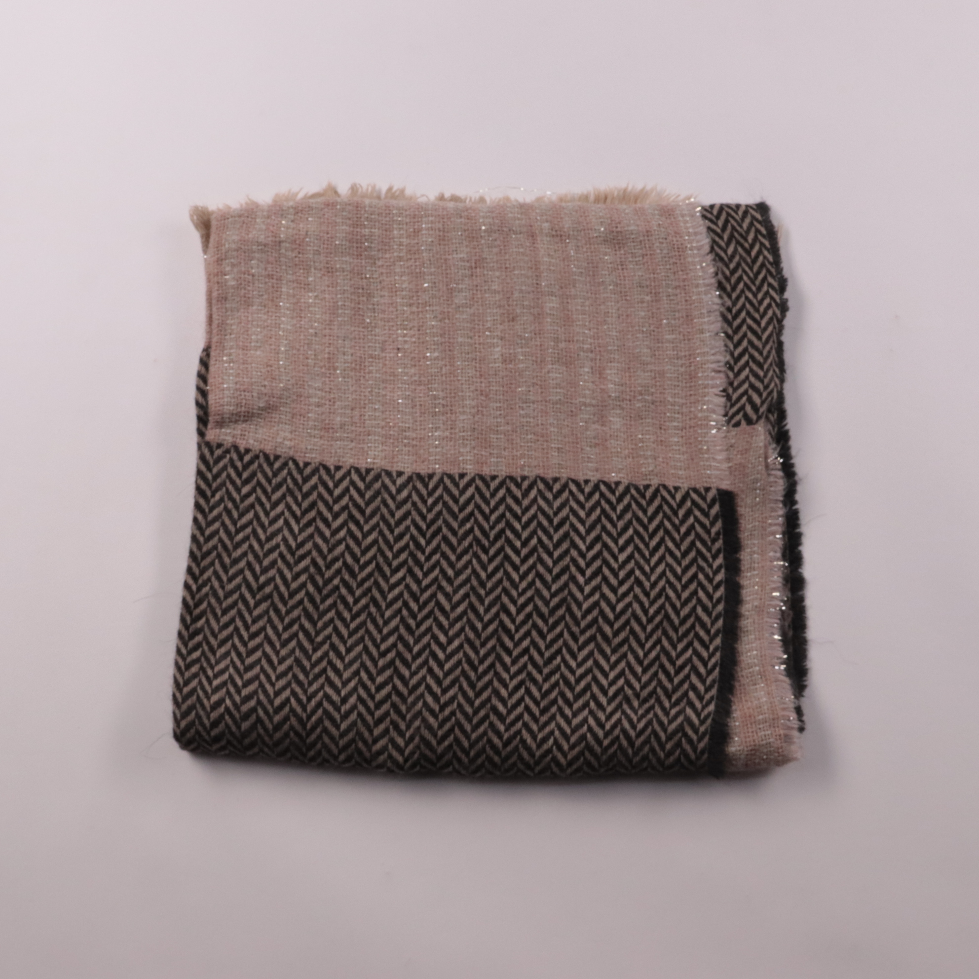 Шарф в бежево‑чёрной гамме с узором «ёлочка» и лёгкой блестящей нитью. Подойдёт для демисезона и прохладных летних вечеров, легко сочетается с пальто и куртками. Мягкая ткань комфортно драпируется и добавляет образу фактуру.