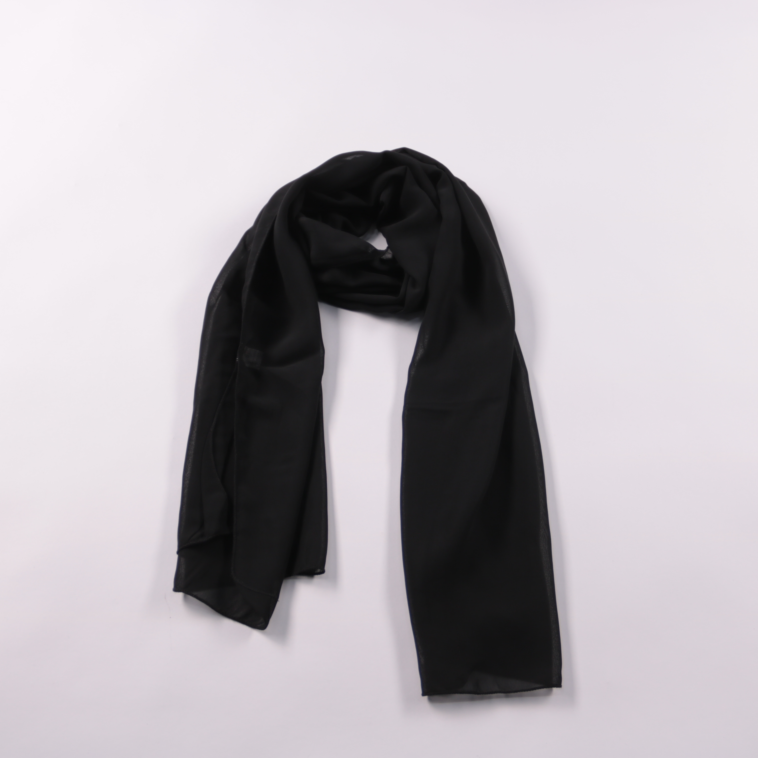 Лёгкий чёрный шарф из 100% полиэстера, подойдёт для повседневных образов и как накидка на вечер. Уместен круглый год: летом защищает от кондиционера, в межсезонье дополняет плащ или куртку. Ткань тонкая и почти не мнётся, удобно брать с собой.