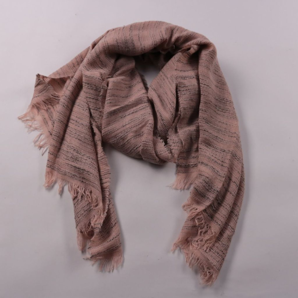 Шарф без указанного бренда в нежно-розовом оттенке с фактурной тканью и бахромой по краям. Подойдёт к повседневным образам и для прохладной погоды, можно носить как палантин. Лёгкий и удобно драпируется.