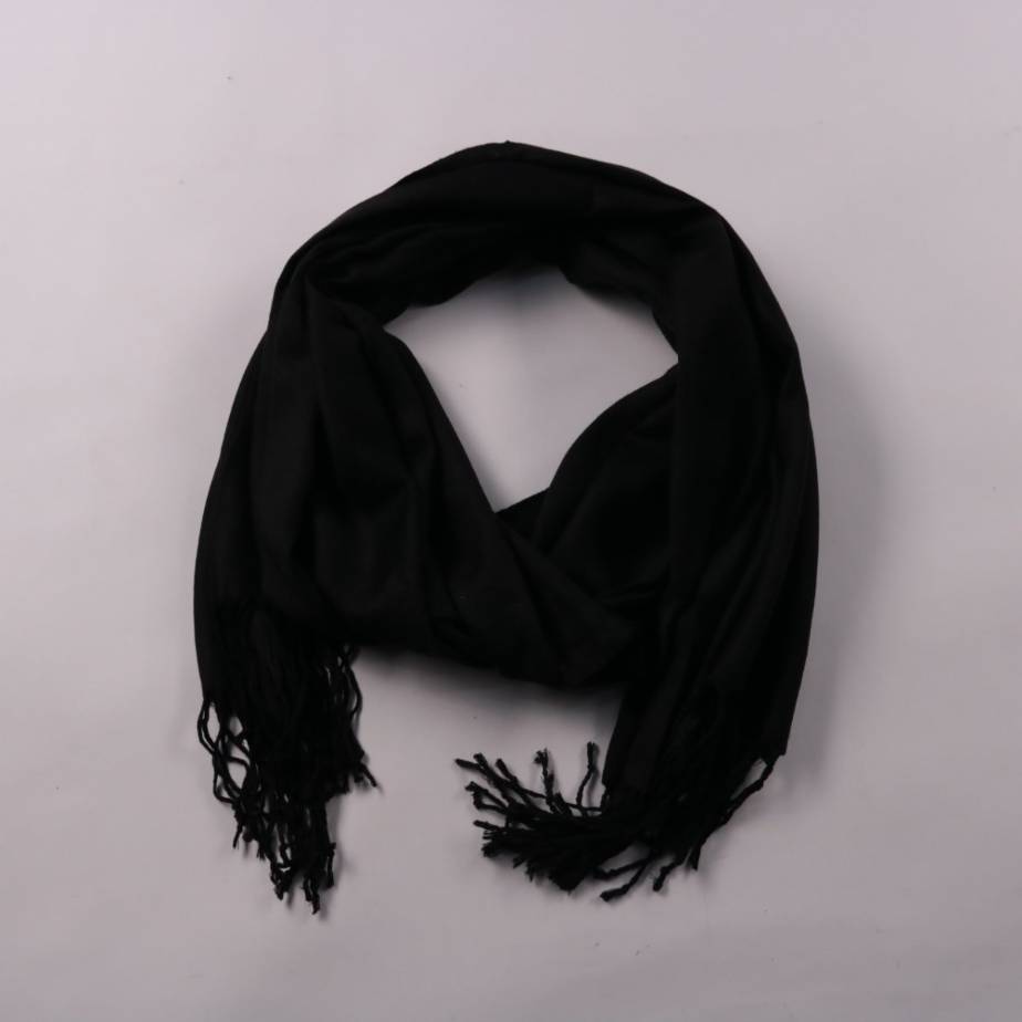 Чёрный шарф без бренда с кисточками по краям. Подойдёт для повседневных образов и делового стиля, можно носить на шее или накидывать на плечи. Однотонный цвет легко сочетается с любой верхней одеждой.