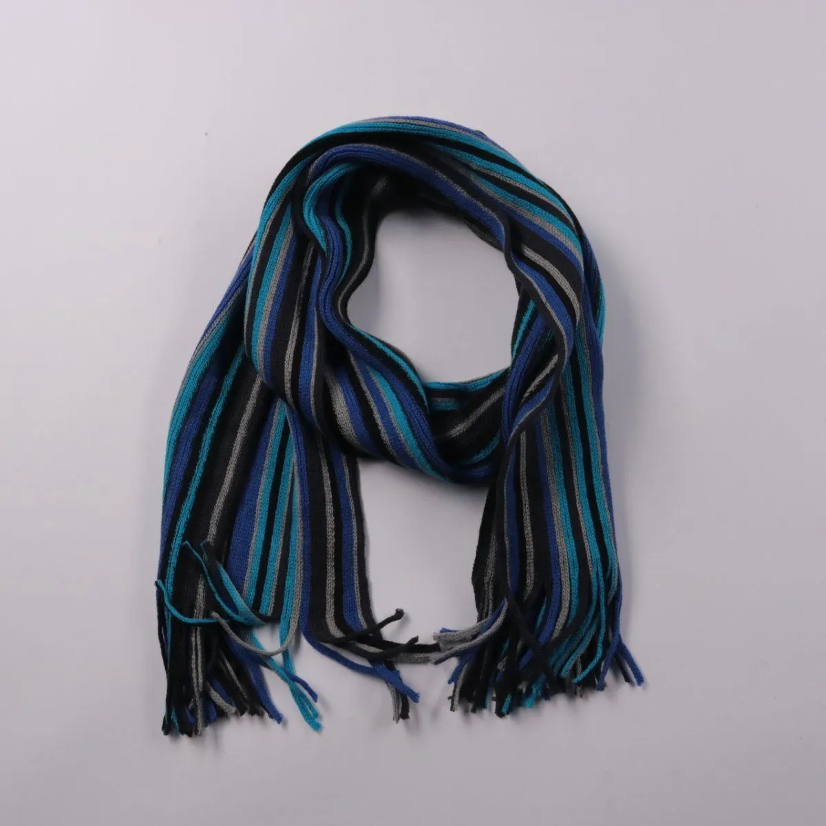 Полосатый шарф в сине-бирюзово-чёрной гамме с кисточками на концах. Подойдёт для повседневных образов осенью и весной, хорошо сочетается с однотонной верхней одеждой. Длинный формат удобно завязывать разными способами и он добавляет тепла в прохладную погоду.