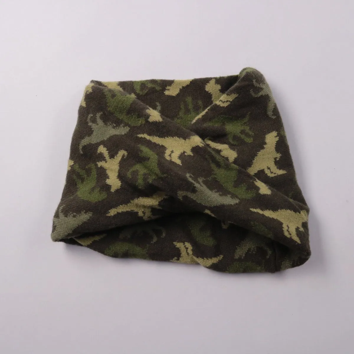 Снуд с камуфляжным принтом и узлом спереди. Подойдёт для прогулок и спорта в прохладную погоду, закрывает уши и фиксирует волосы. Мягкий трикотаж тянется и удобно сидит.