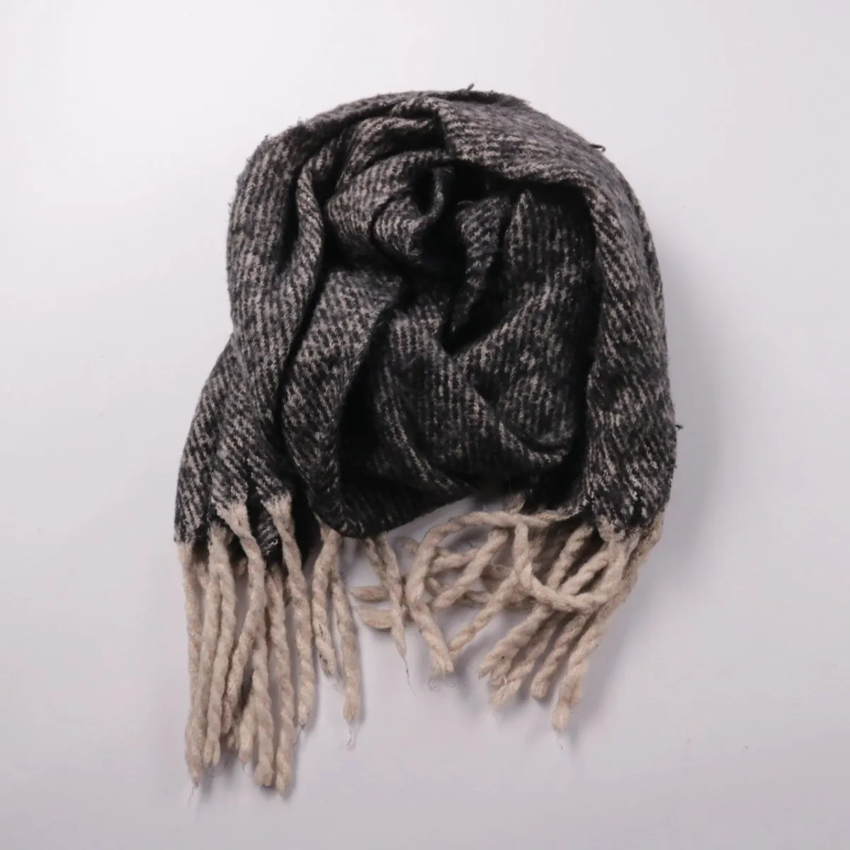 Тёплый шарф без указанного бренда, выполнен в серо-чёрной фактурной ткани с бежевой бахромой. Подойдёт для повседневных образов в холодную погоду, удобно носить с пальто или пуховиком. Практичный плюс — нейтральные цвета легко сочетаются с разной верхней одеждой.