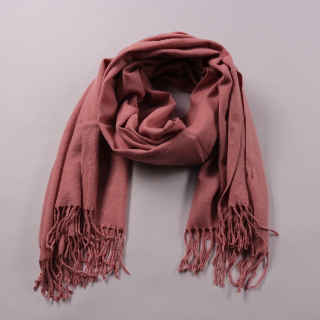 Однотонный розовый шарф с кисточками по краям, без видимых логотипов. Подойдёт для повседневных образов в прохладную погоду и для многослойных комплектов. Легко драпируется и добавляет тепла за счёт широкого полотна.