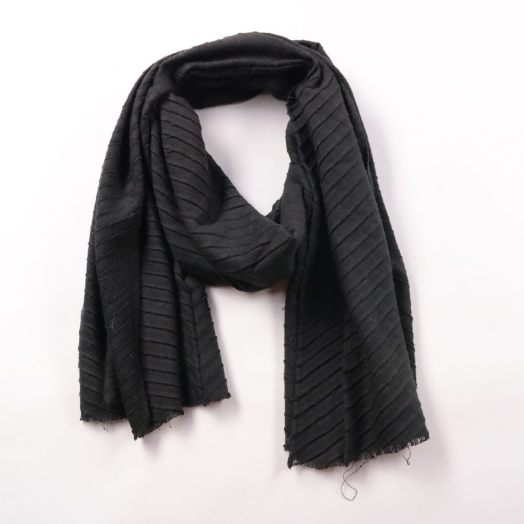 Чёрный шарф Primark с фактурными диагональными полосами и лёгкой бахромой по краю. Подойдёт для прохладной погоды и многослойных образов в городе. Практичен тем, что легко сочетается с любой верхней одеждой и не маркий.