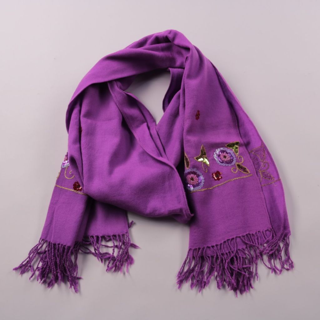 Фиолетовый шарф с вышивкой цветочного мотива и декоративными элементами, по краям — бахрома. Подойдёт для демисезона и прохладных вечеров как акцент к однотонному пальто или куртке. Легко драпируется и добавляет образу цвета без лишнего объёма.