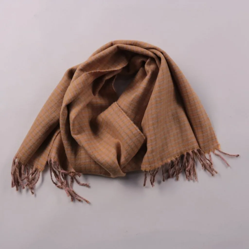 Шарф без бренда в бежево-коричневой гамме с мелким клетчатым узором и кисточками по краю. Подойдёт для повседневных образов в прохладную погоду, можно носить поверх пальто или куртки. Практичное преимущество — легко драпируется и добавляет дополнительн...