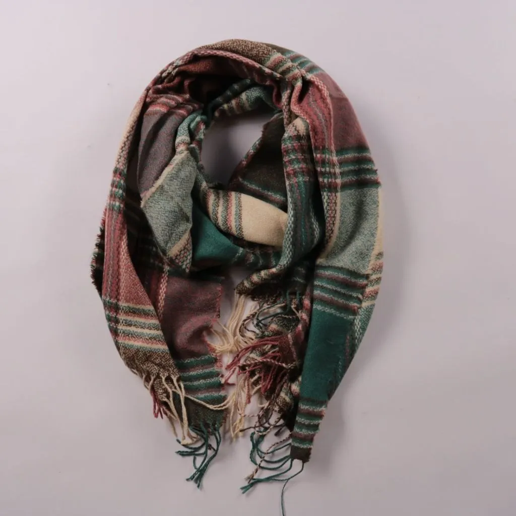 Шарф в клетку с кисточками по краю, бренд не указан. Подойдёт для зимних и прохладных дней, хорошо сочетается с пальто и куртками в спокойных оттенках. Практичный плюс — можно носить как шарф или накидывать на плечи как небольшой палантин.