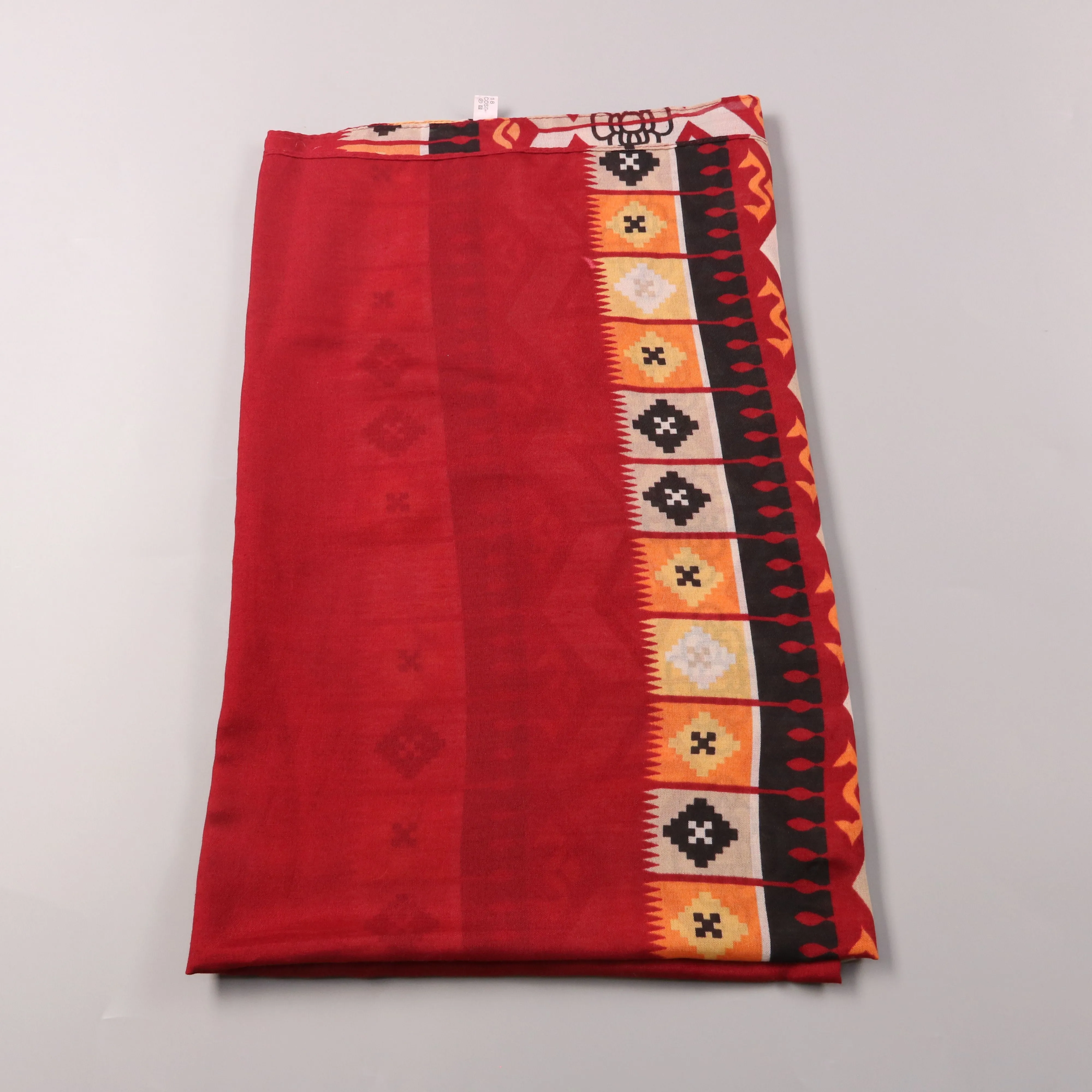 Лёгкий шарф с этническим орнаментом по краям в красной гамме. Подойдёт для весны и прохладных летних вечеров, чтобы добавить акцент к повседневным образам. Вискоза мягко драпируется и почти не занимает места в сумке.