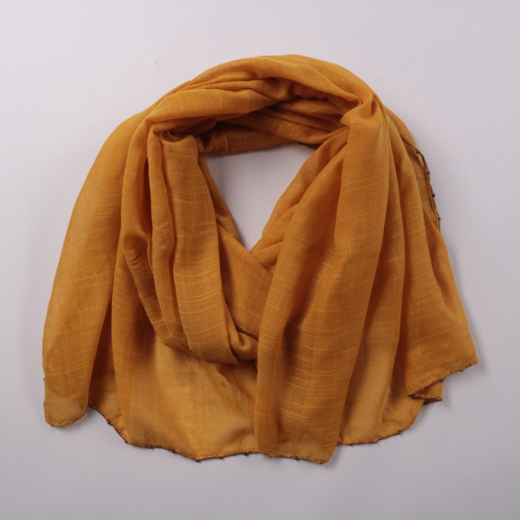 Лёгкий шарф горчичного цвета из тонкой фактурной ткани. Подойдёт для демисезона и прохладных летних вечеров, хорошо драпируется и добавляет акцент в образ. Компактно складывается и удобно брать с собой в сумку.