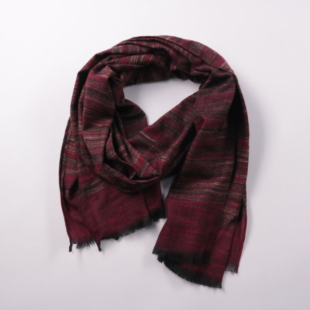 Шарф с полосатым узором в бордовых тонах, подойдёт для повседневных образов и на прохладную погоду. Удобно драпируется и добавляет тепла за счёт плотного переплетения ткани.