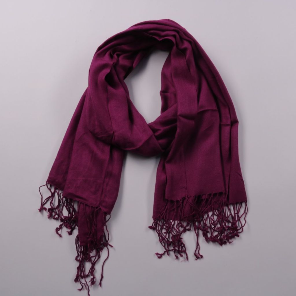 Шарф глубокого бордового цвета с кисточками по краям, без видимых логотипов. Подойдёт для повседневных образов и в качестве накидки в прохладную погоду. Лёгкий материал удобно драпируется и компактно складывается.