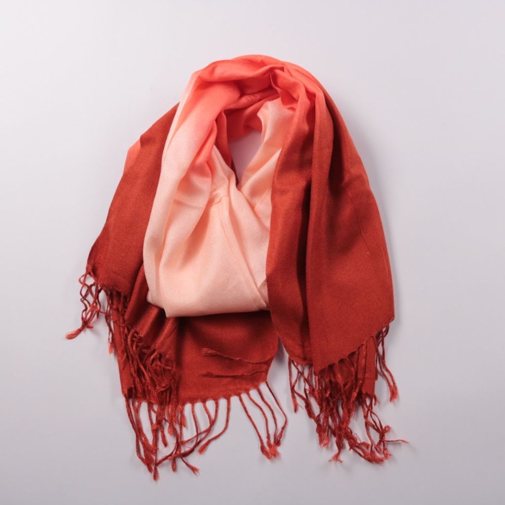 Шарф с бахромой и градиентной окраской в красно-розовых тонах. Подойдёт для повседневных образов в прохладную погоду и как акцент к однотонной верхней одежде. Легко драпируется и можно носить разными способами.