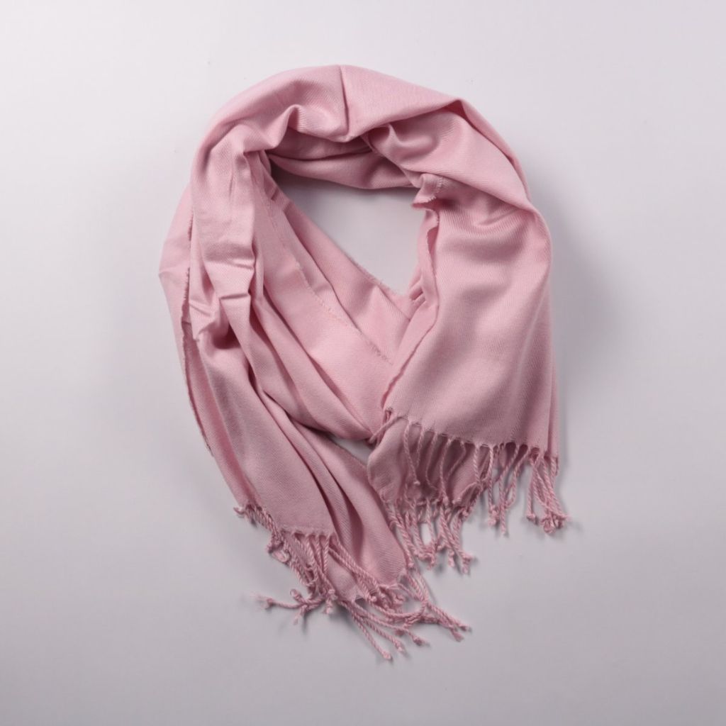Шарф нежно-розового цвета с бахромой по краям, без заметного декора. Подойдёт для повседневных образов и лёгкого утепления в прохладную погоду. Легко драпируется и занимает мало места в сумке.