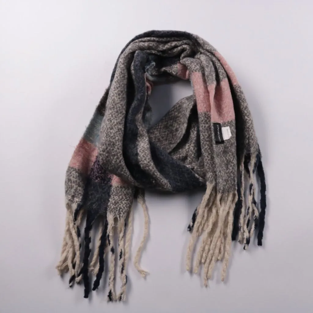 Шарф James Lakeland в клетку с бахромой, выполнен в серо-сине-розовой гамме. Подойдёт для повседневных зимних образов и утепления в прохладную погоду. Материал 100% полиэстер — легко стирается и быстро сохнет.