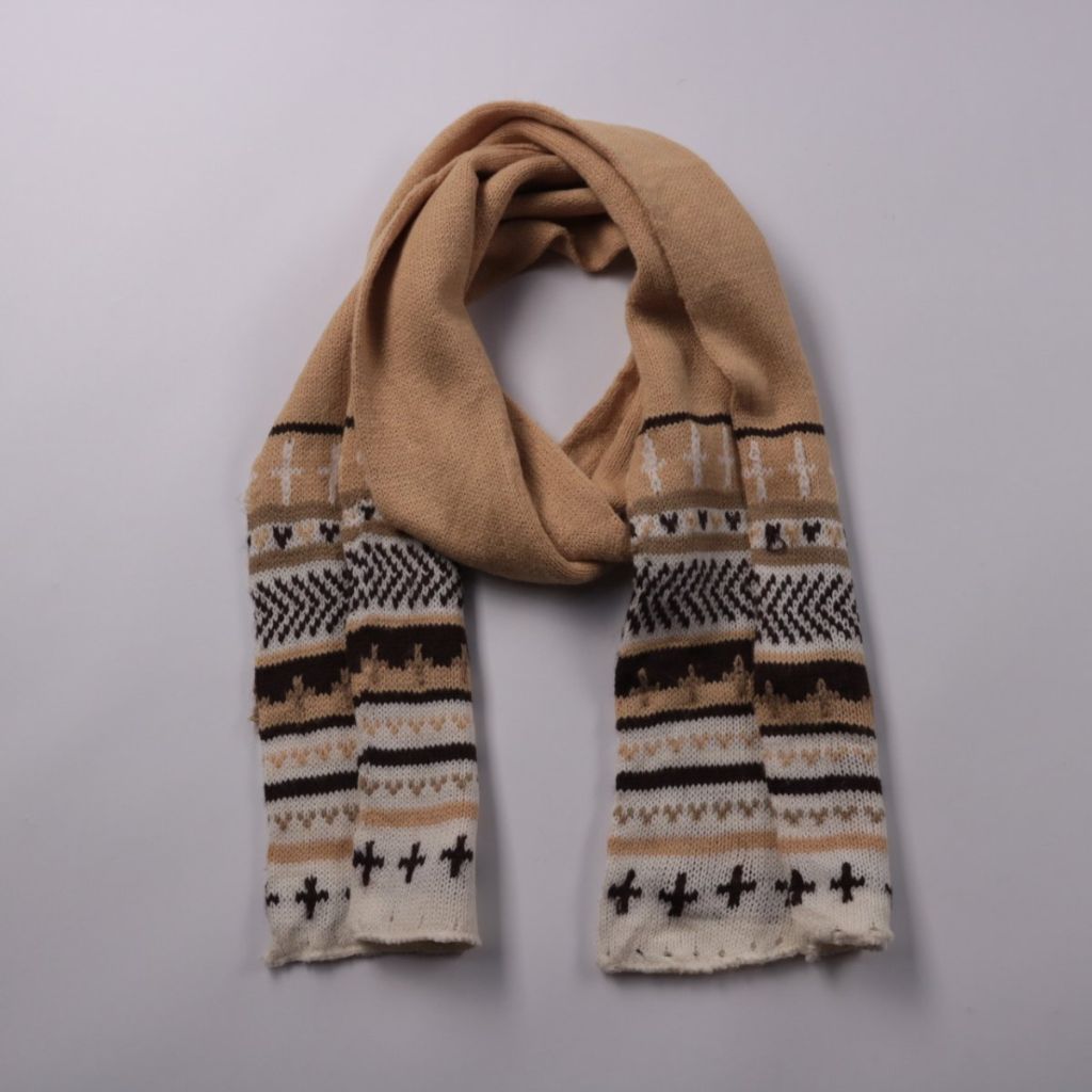 Вязаный шарф с орнаментом в бежево-бело-чёрной гамме. Подойдёт для зимних прогулок и повседневных образов, хорошо сочетается с пальто и пуховиком. Длинный формат позволяет завязывать в несколько оборотов и лучше защищает шею от ветра.