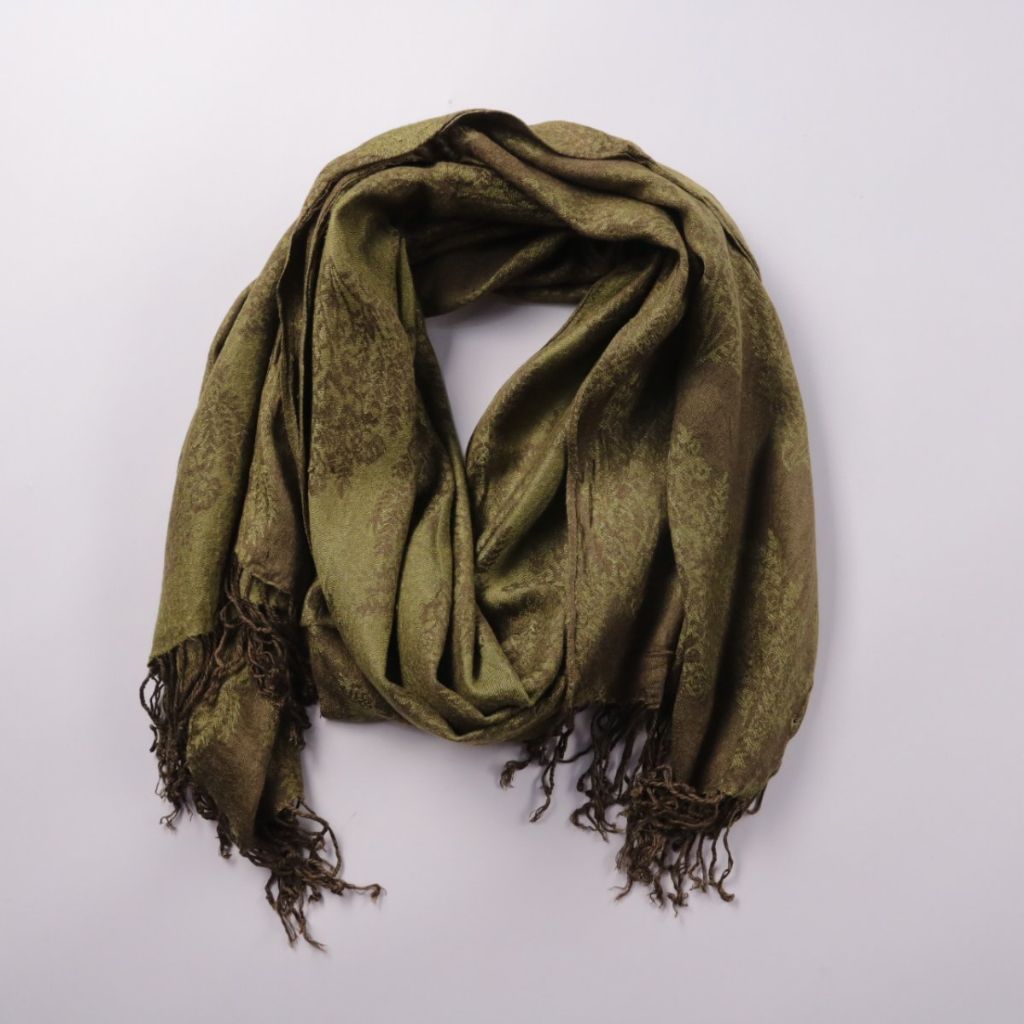 Шарф с жаккардовым узором и кисточками по краям, без указания бренда. Подойдёт для повседневных образов в прохладную погоду и для многослойных сочетаний. Лёгкая ткань удобно драпируется и не занимает много места в сумке.