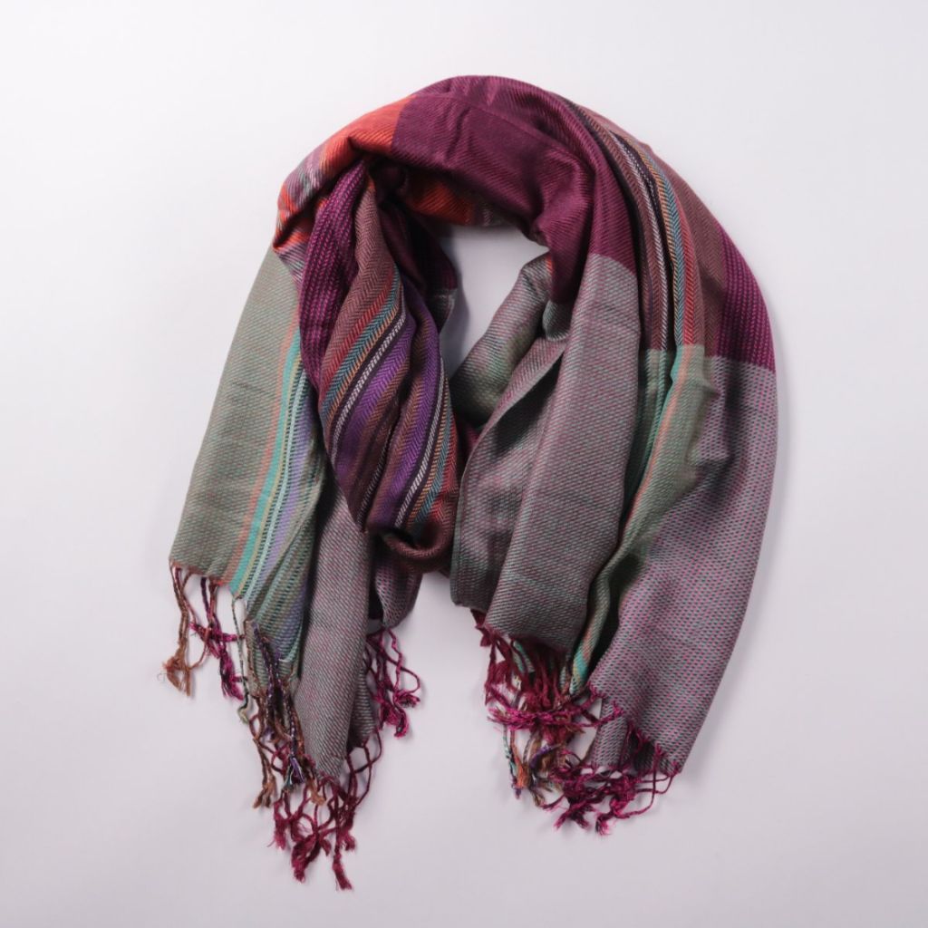 Тканый шарф без бренда в разноцветной гамме (бордовый, серый, зелёный) с бахромой по краям. Подойдёт для повседневных образов и поездок в прохладную погоду, можно носить на шее или накидывать на плечи. Лёгкий и компактно складывается в сумку.