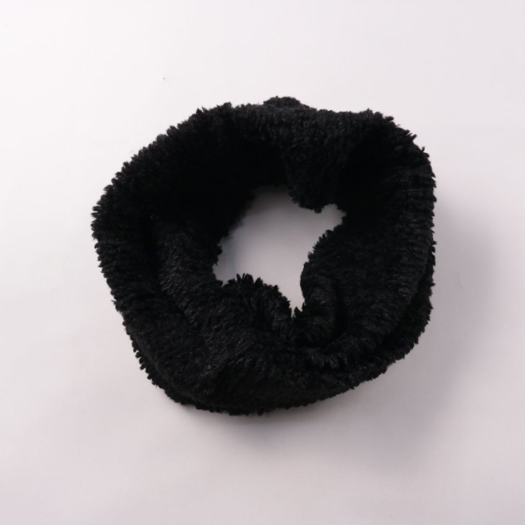 Чёрный плюшевый снуд без бренда, мягкий и объёмный. Подойдёт для прогулок в холодную погоду и для повседневных образов. Удобен тем, что надевается одним движением и хорошо закрывает шею от ветра.