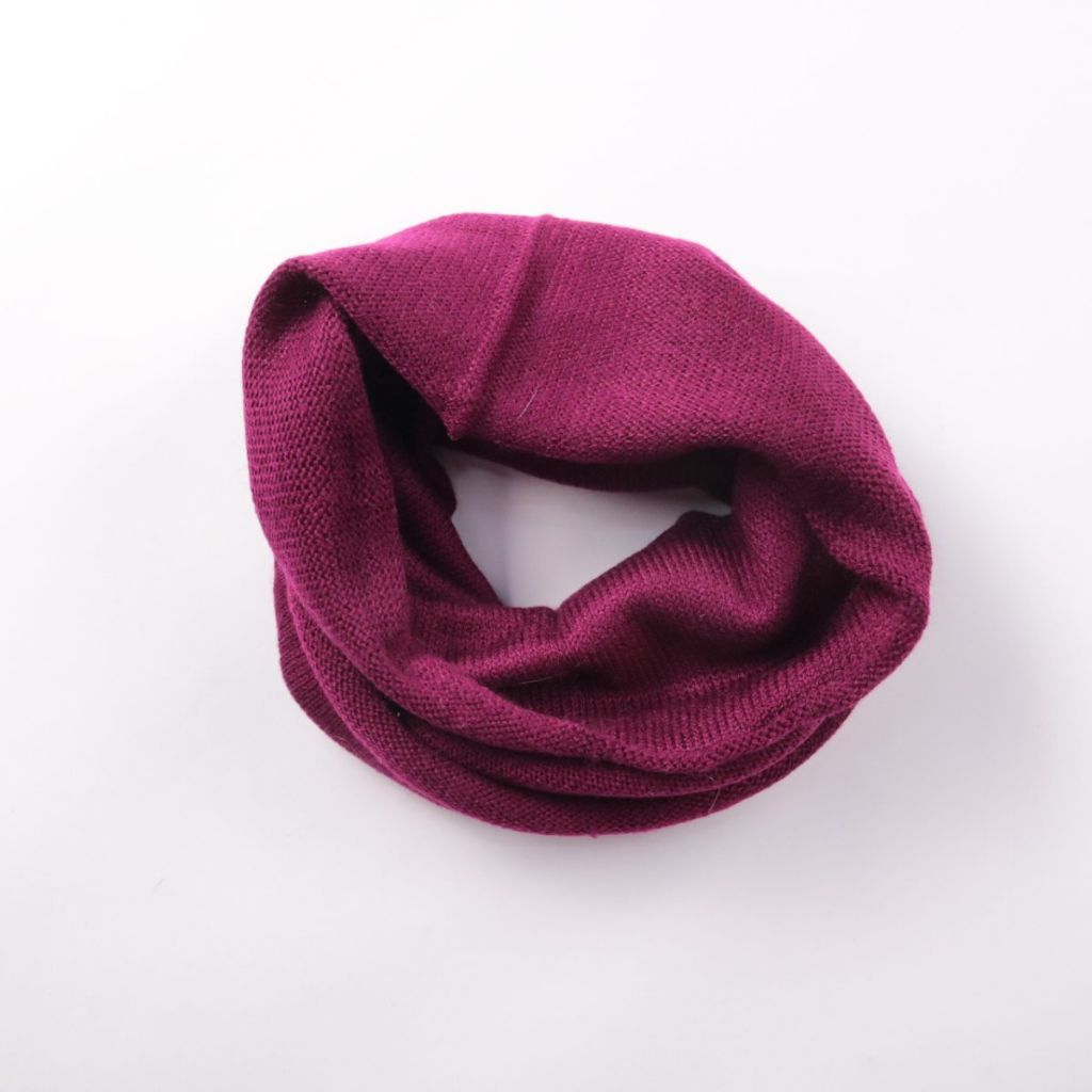 Трикотажный снуд без бренда в бордовом цвете. Подойдёт для повседневной носки в прохладную погоду и легко сочетается с куртками и пальто. Удобен тем, что надевается одним движением и не развязывается как обычный шарф.