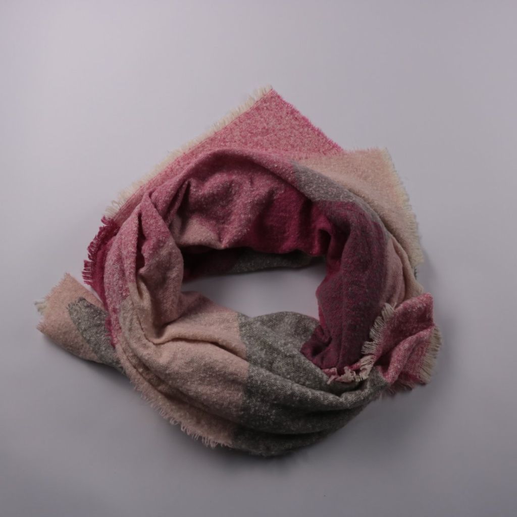 Шарф без бренда в клетку с мягкой фактурой и бахромой по краям. Подойдёт для повседневных образов в прохладную погоду осенью и зимой. Хорошо укутывает шею и добавляет тепла за счёт плотного полотна.