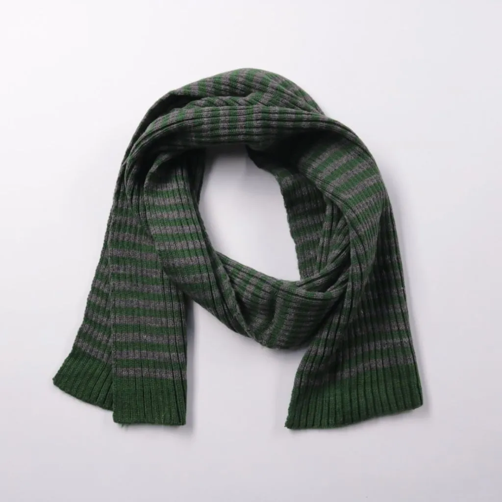 Вязаный шарф в зелёно-серую полоску без видимых следов износа. Подойдёт для повседневной носки в холодную погоду и легко сочетается с тёмной верхней одеждой. Мягкая вязка хорошо удерживает тепло и удобно драпируется.
