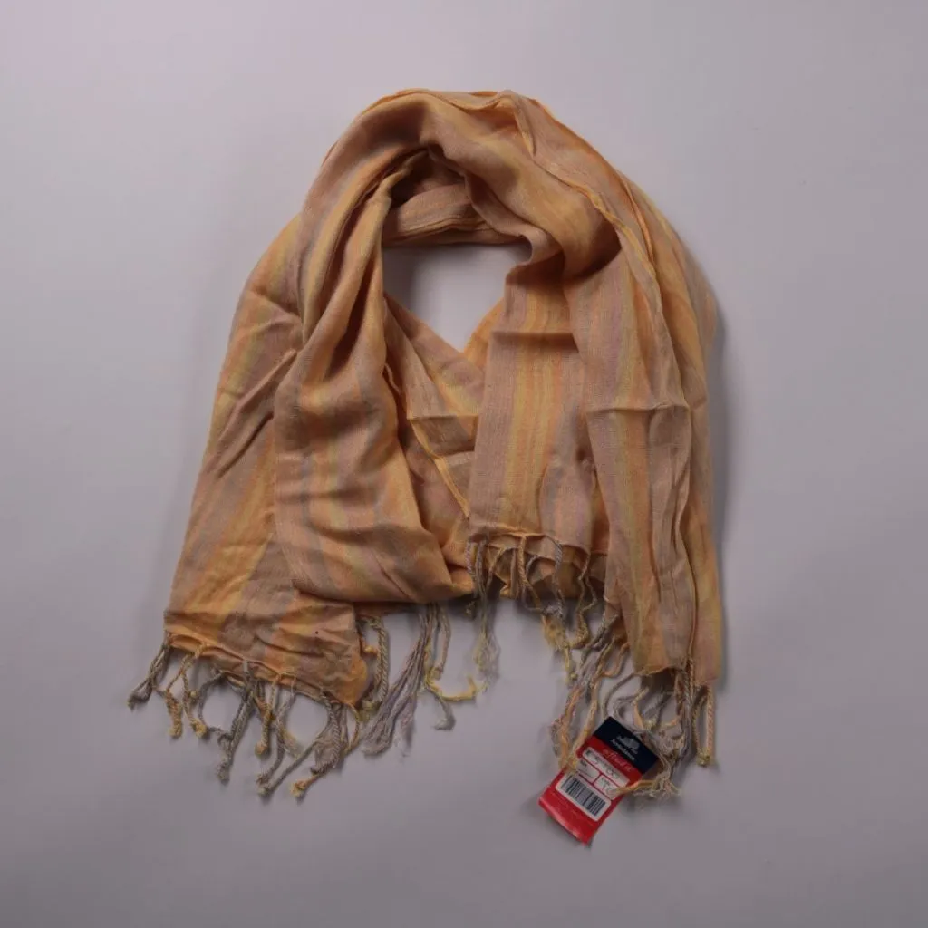 Лёгкий полосатый шарф с кисточками по краю, бренд по бирке не читается. Подойдёт для прогулок и поездок, чтобы утеплиться в прохладную погоду или в кондиционируемых помещениях. Удобно складывается и не занимает много места в сумке.