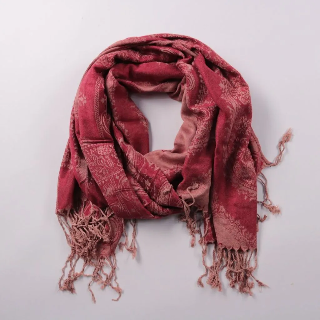 Шарф с жаккардовым узором в бордово-розовой гамме и кистями по краю. Подойдёт для повседневных образов с пальто или курткой в прохладную погоду. Можно носить как шарф или как лёгкий палантин — хорошо драпируется.
