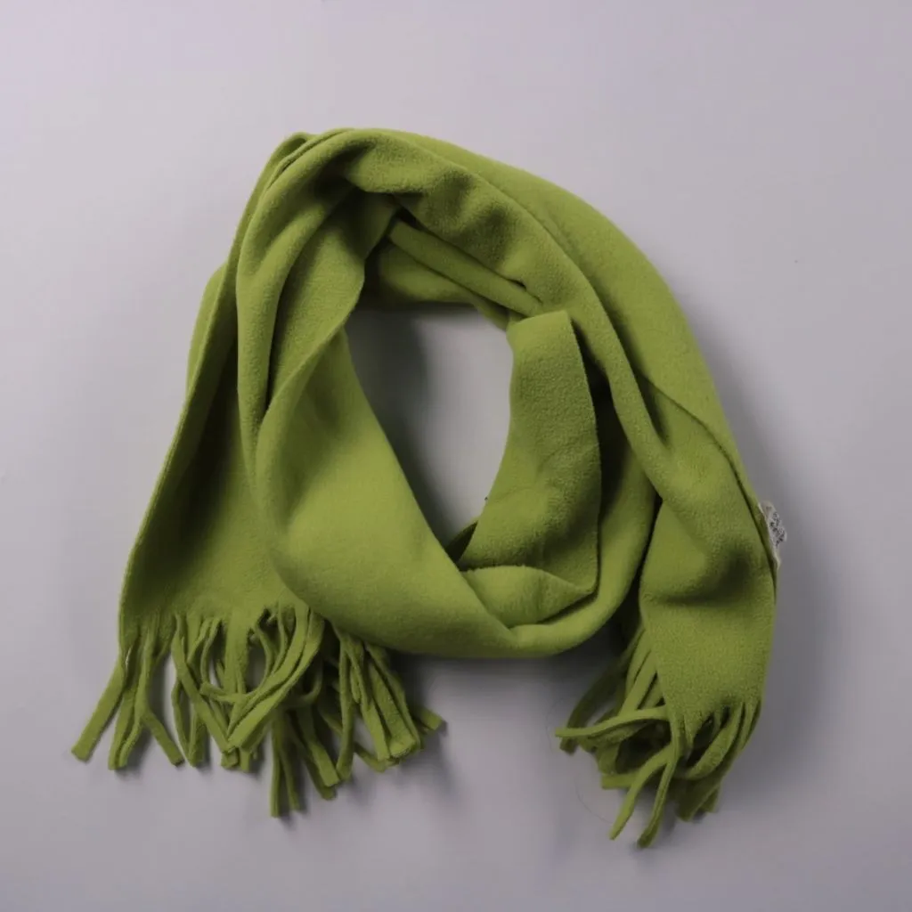 Шарф из мягкого флиса с бахромой, без видимого бренда. Подойдёт для прогулок и повседневной носки в прохладную погоду, легко сочетается с верхней одеждой. Практичен в уходе и быстро сохнет.