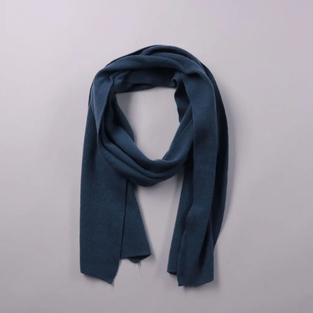 Трикотажный шарф синего цвета без видимых логотипов. Подойдёт для повседневных образов в прохладную погоду, чтобы защитить шею от ветра. Мягкий материал удобно драпируется и легко завязывается.
