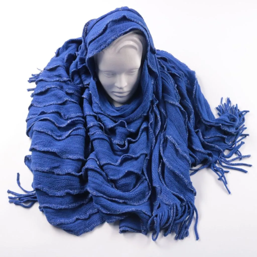 Вязаный шарф без бренда насыщенного синего цвета, с рельефной фактурой и бахромой по краям. Подойдёт для зимних прогулок и повседневных образов, можно носить как шарф или накидывать на голову. Объёмная вязка хорошо удерживает тепло и защищает шею от ве...
