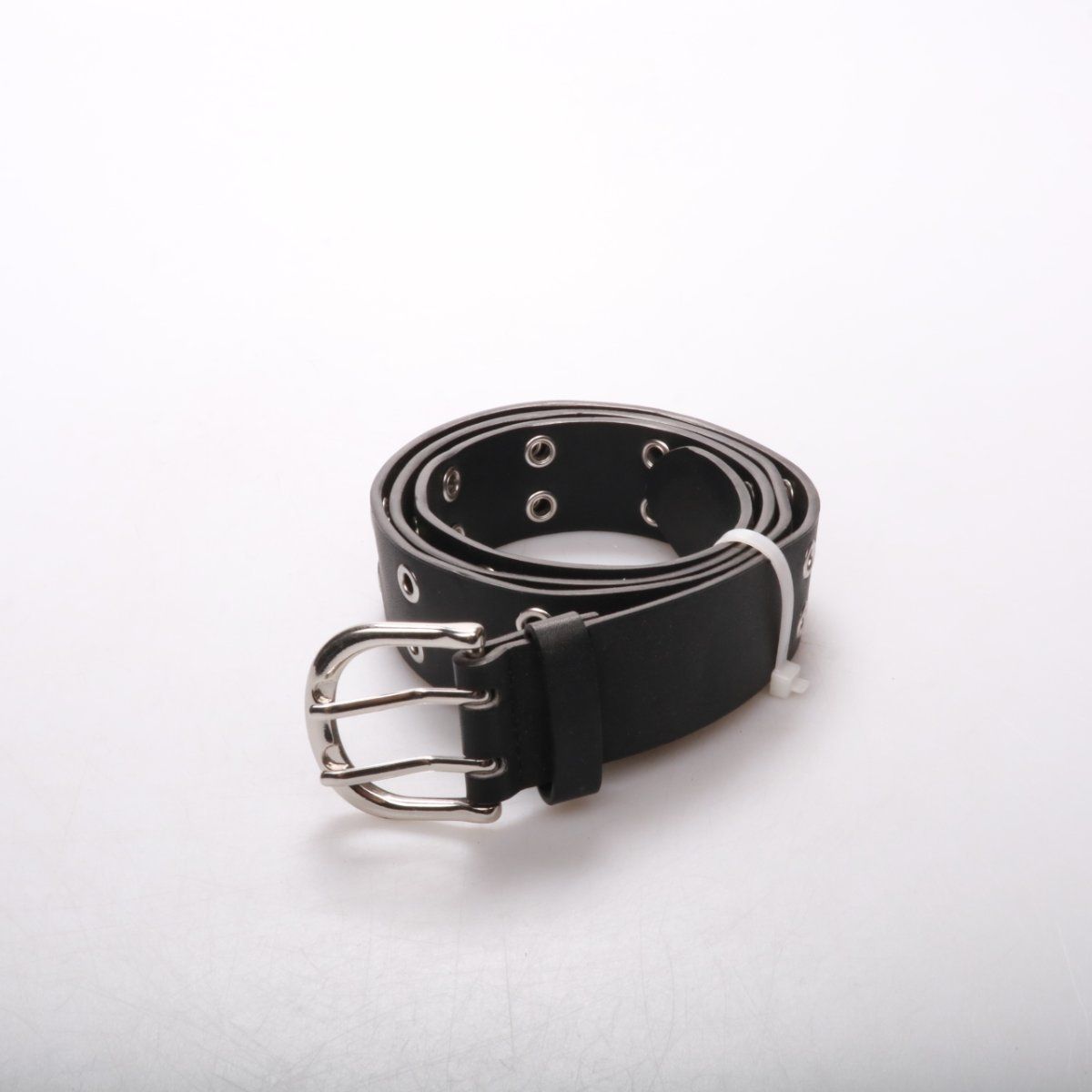 Чёрный ремень с люверсами и металлической пряжкой, подойдёт к джинсам, брюкам или юбке в повседневных образах. Благодаря множеству отверстий легко подгоняется по талии и удобно фиксируется.