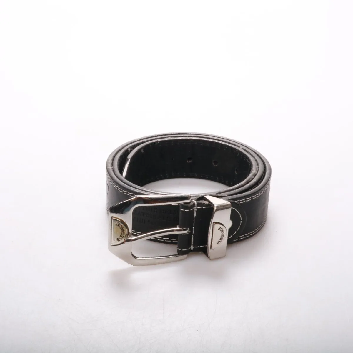 Ремень Elegance из чёрного материала с контрастной белой строчкой и металлической пряжкой. Подойдёт для повседневных образов с джинсами или брюками и для более строгого стиля. Крепкая пряжка надёжно фиксирует ремень и держит форму.