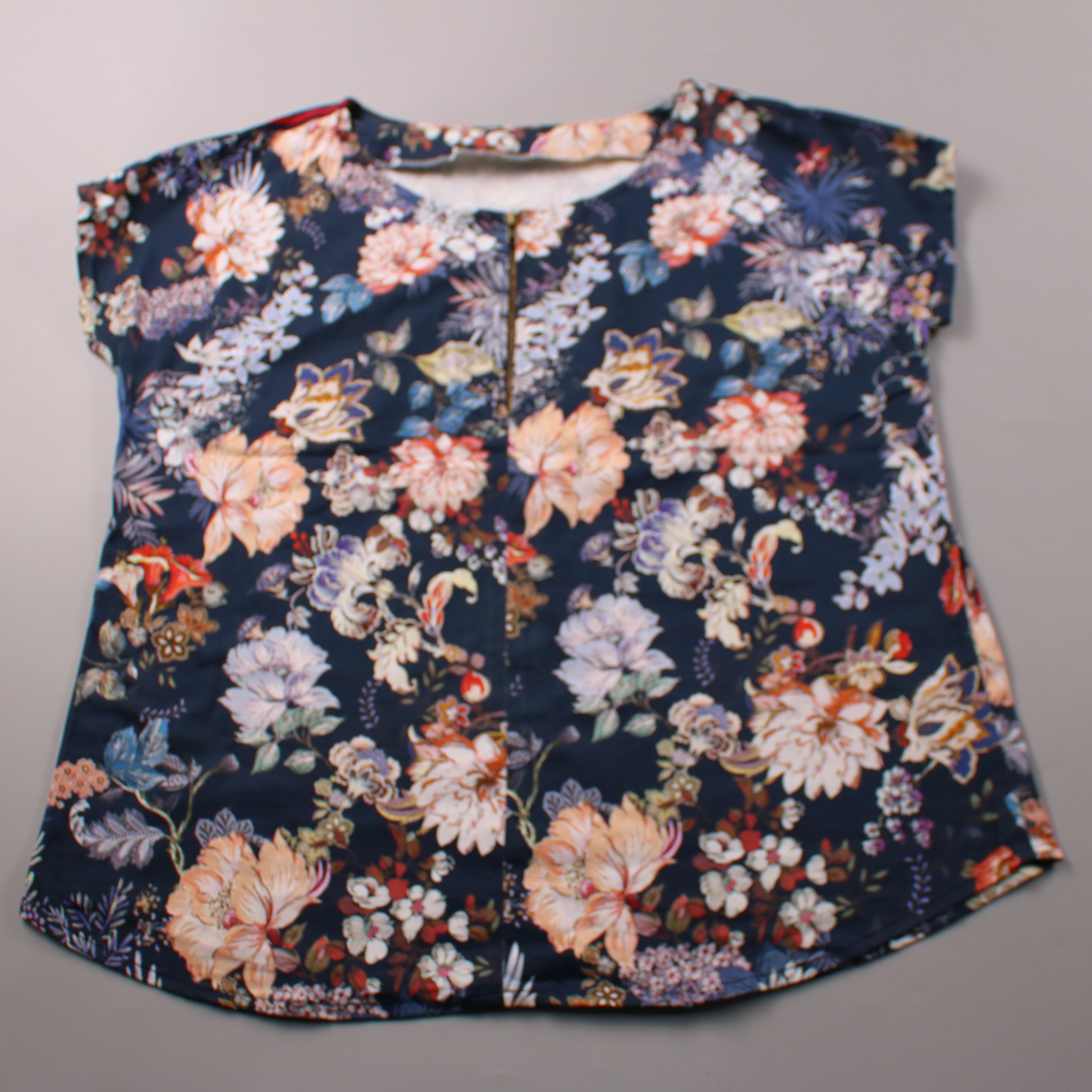 Детская блузка с цветочным принтом на тёмно-синем фоне и коротким рукавом. Подойдёт для летних прогулок и праздников, легко сочетается с юбкой или шортами. Ткань лёгкая и быстро сохнет после стирки.