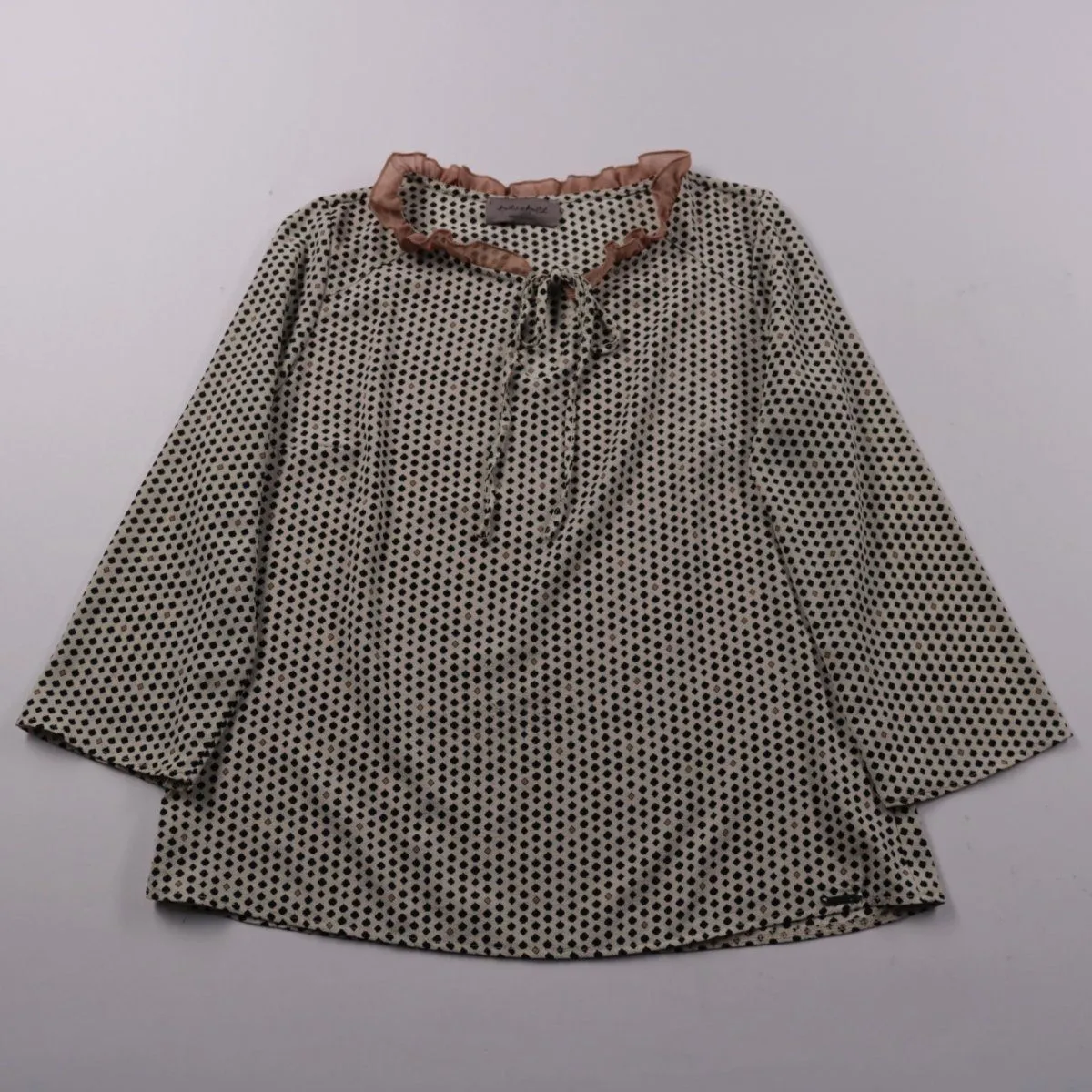 Блузка Amelie & Amelie для девочки в мелкий горошек, с рюшей по горловине и завязками спереди. Подойдёт для школы и прогулок в демисезон, хорошо сочетается с юбкой или брюками. Лёгкая ткань и свободный крой не сковывают движения.