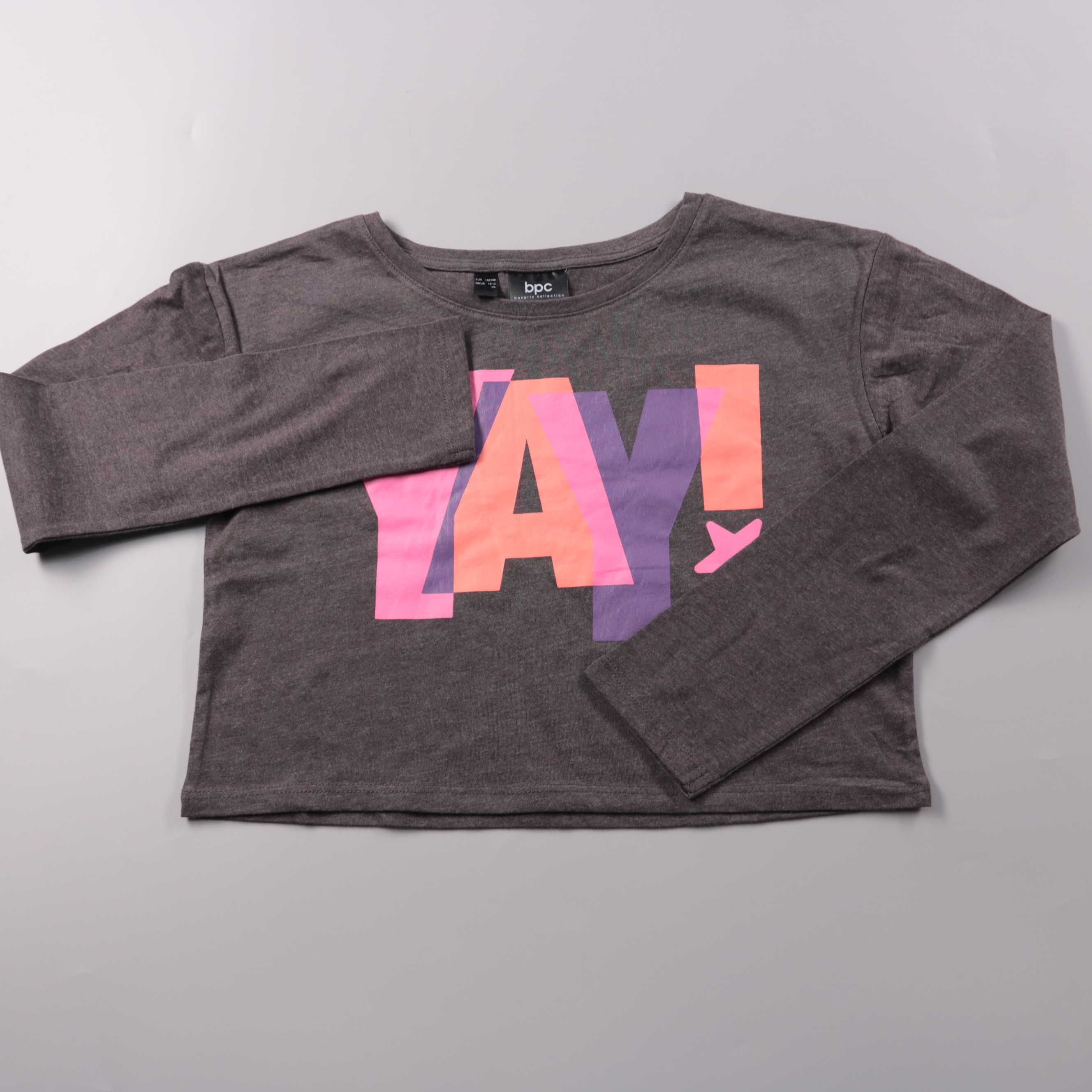 Лонгслив BPC (bonprix collection) из мягкого трикотажа, серого цвета с ярким принтом «YAY!» на груди. Подойдёт для школы, прогулок и повседневной носки в любое время года, удобно носить как самостоятельный слой или под куртку. Материал с добавлением по...