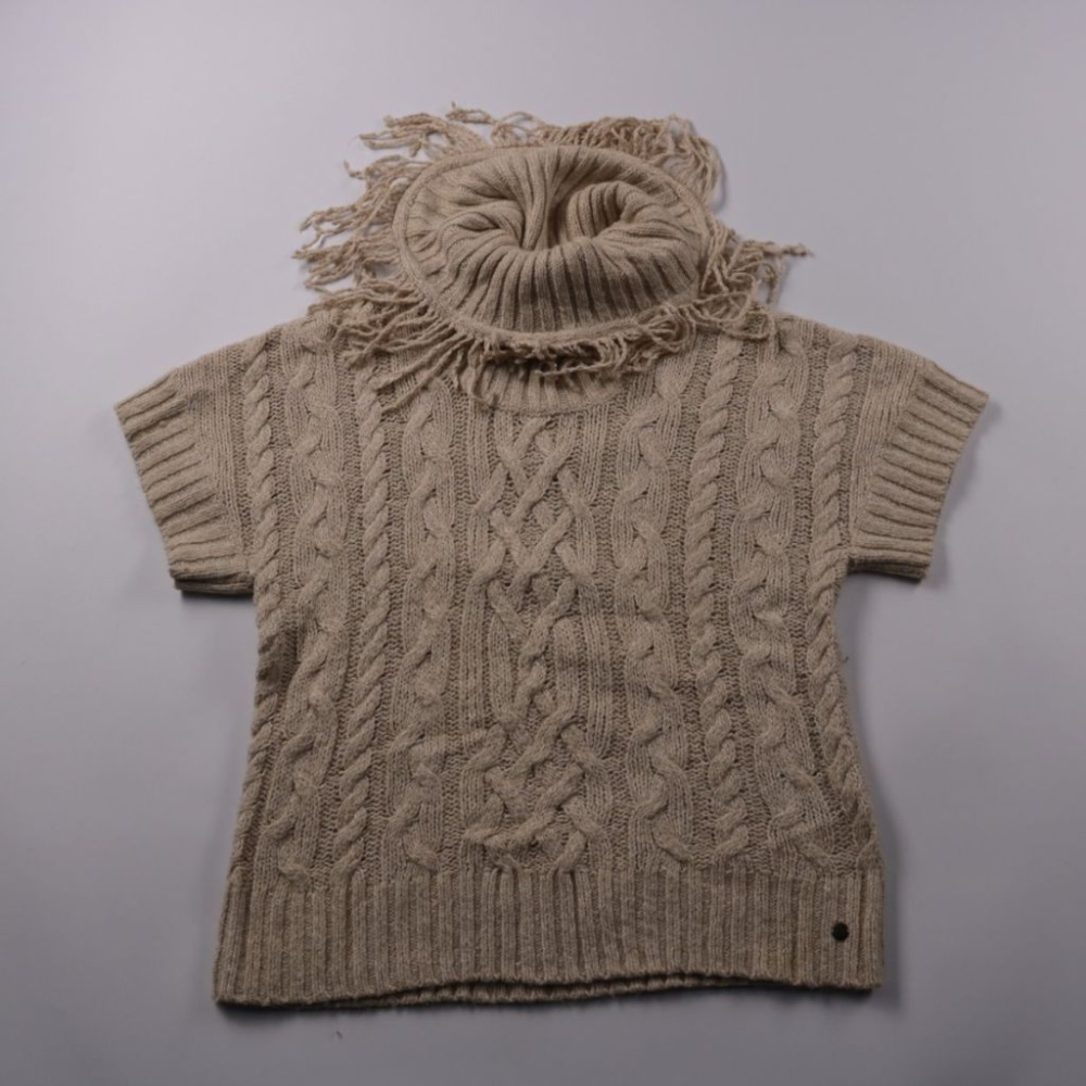 Вязаный свитер S.Oliver бежевого цвета с коротким рукавом и высоким воротником-хомутом с декоративной бахромой. Подойдёт для школы и прогулок в прохладную погоду, удобно носить как самостоятельный верх или под жилет/куртку. Плотная вязка с косами хорош...