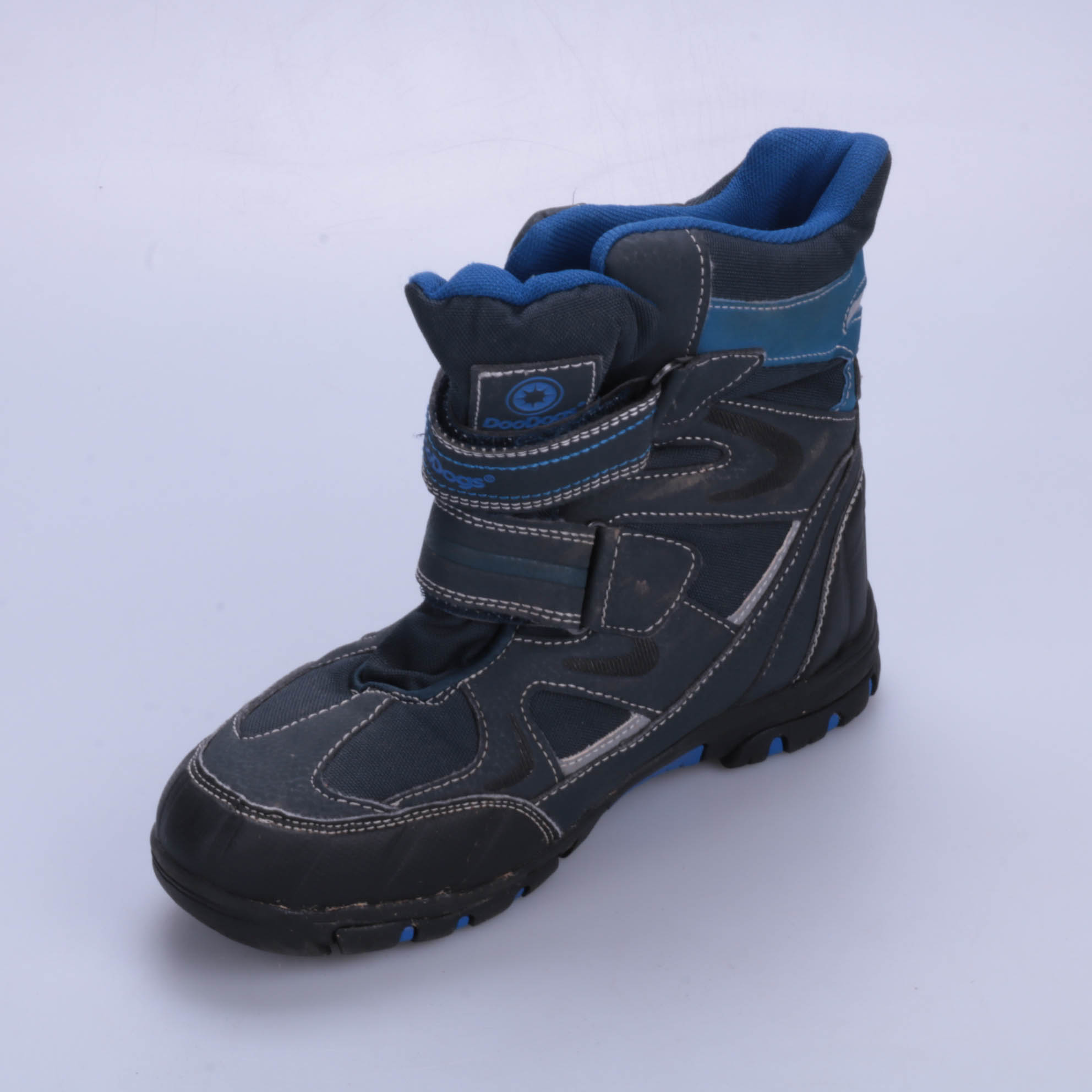 Зимние ботинки DooDogs для мальчика в темно-синем цвете, высокий берц и фиксация на липучках. Подойдут для прогулок в холодную погоду, внутри мягкая подкладка и удобная посадка. Рельефная подошва меньше скользит и хорошо держит на снегу.