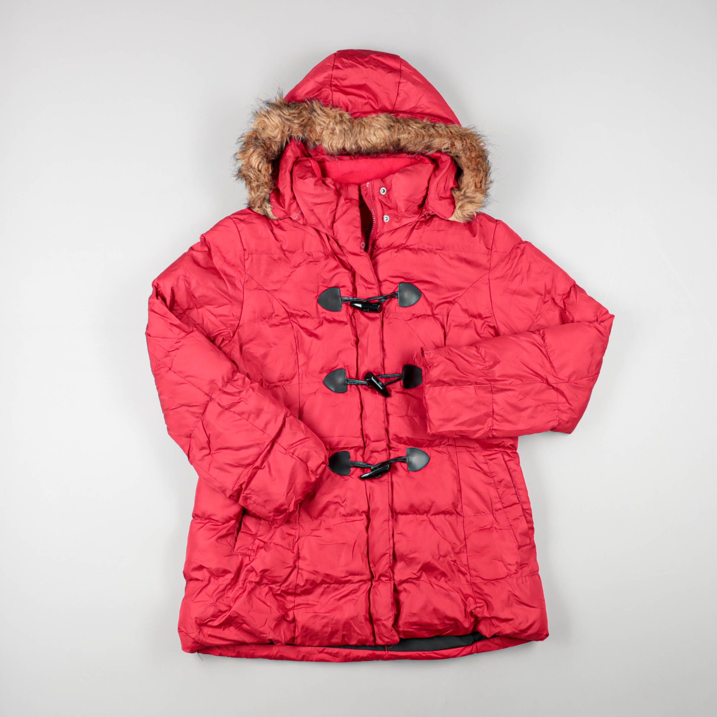 Зимний пуховик с капюшоном и меховой окантовкой, яркого красного цвета. Подойдёт для прогулок и дороги в школу в холодную погоду. Тёплый утеплитель и застёжки-клеванты помогают лучше удерживать тепло.