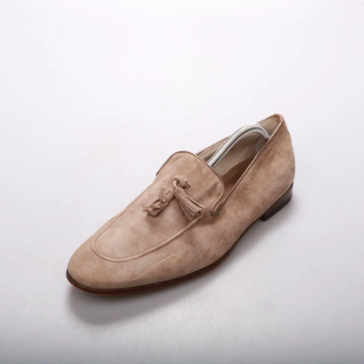 Мужские туфли-лоферы F.lli Rosso из натуральной замши бежевого цвета, с декоративными кисточками. Подойдут для офиса и выходов в стиле smart casual, хорошо сочетаются с брюками и чиносами. Практичное преимущество — кожаная подошва и устойчивый низкий каблук для аккуратной посадки и комфортной ходьбы.