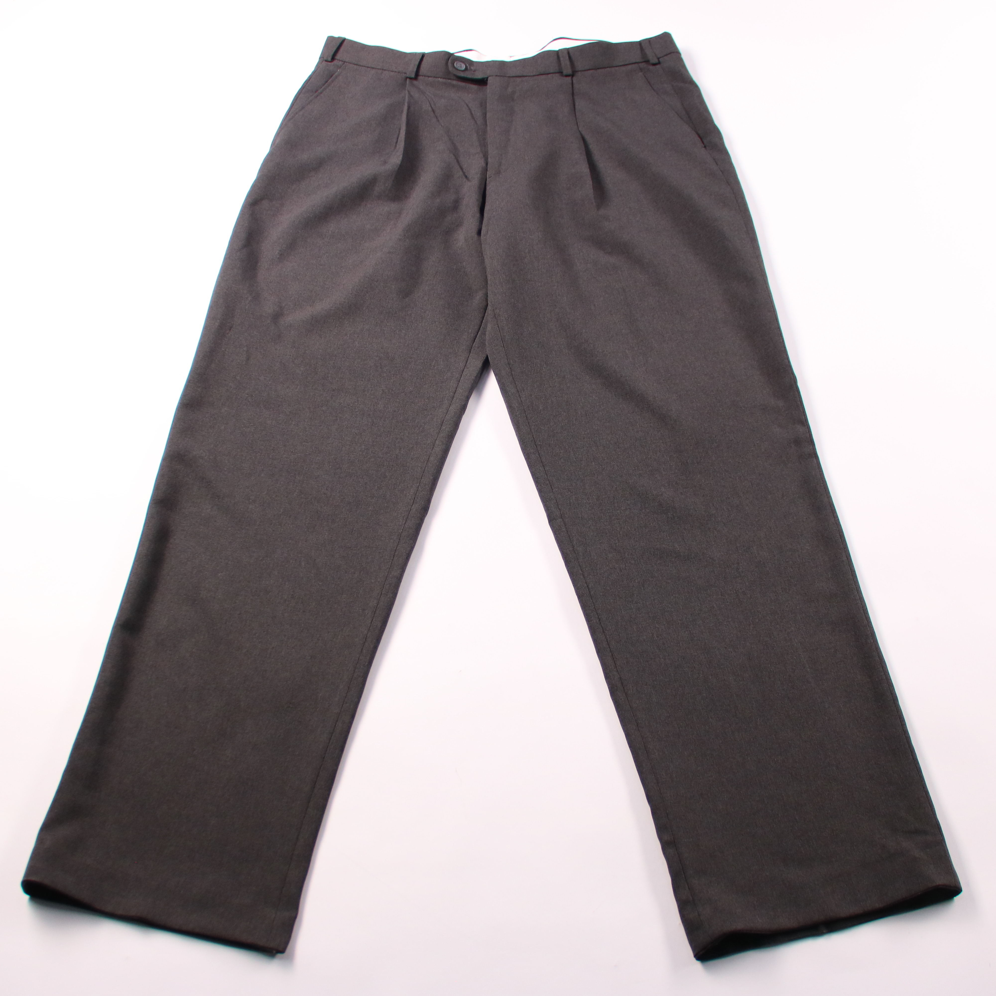 Мужские классические брюки тёмно-серого цвета со стрелками и защипами спереди. Подойдут для офиса и торжественных случаев, хорошо сочетаются с рубашкой и пиджаком. Практичный полиэстер почти не мнётся и прост в уходе.