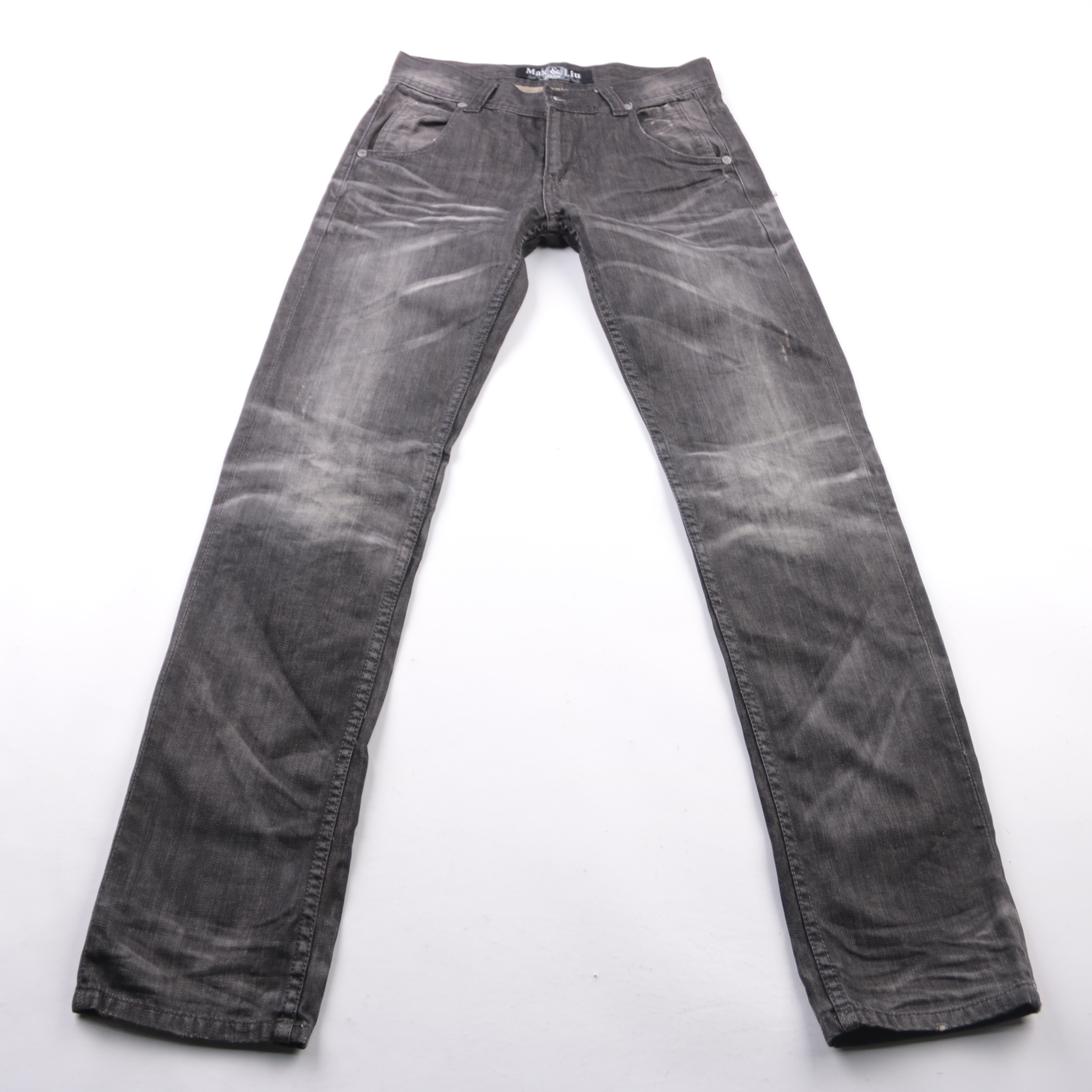 Мужские джинсы Mak&Liu серого цвета с эффектом потертости. Подойдут для повседневных образов в городе и на прогулки, хорошо сочетаются с кроссовками и ботинками. Плотный деним практичен в носке и не так заметно собирает мелкие загрязнения.