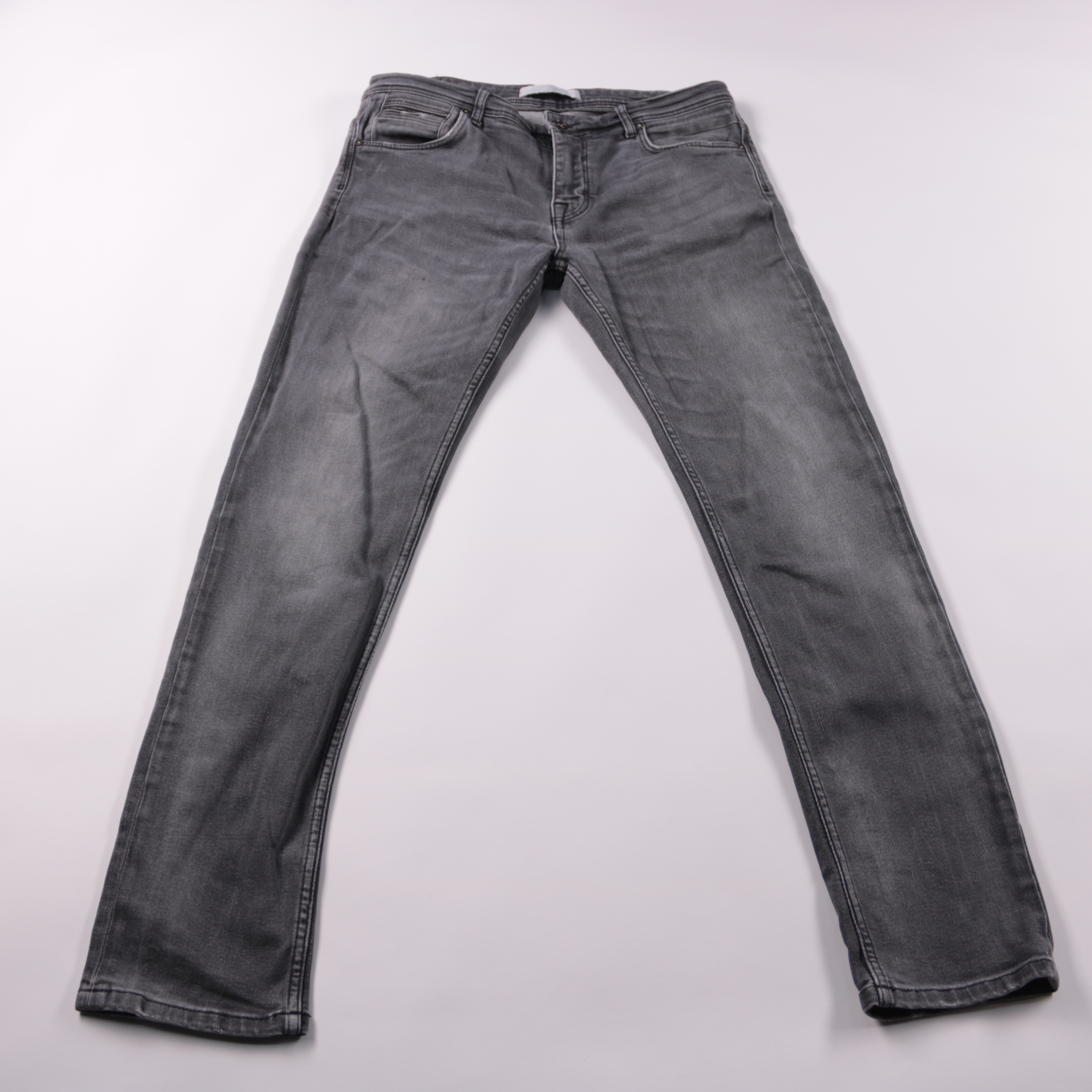 Мужские джинсы Zara Premium Denim серого цвета с классической посадкой и пятью карманами. Подойдут на каждый день и легко сочетаются с футболками, худи и рубашками. Плотный деним хорошо держит форму и удобен в носке.